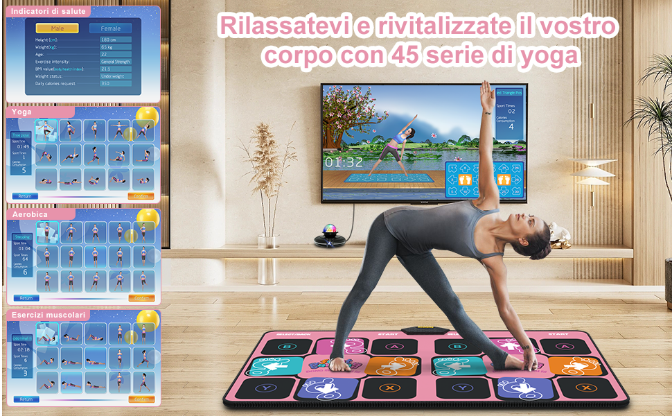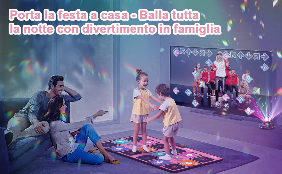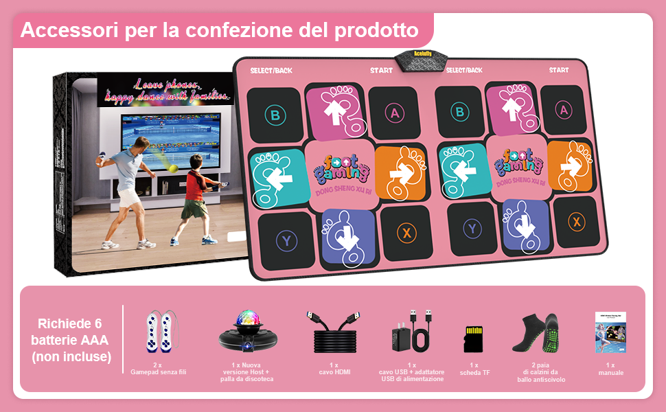 Informazioni su questo articolo Tappetino da ballo energizzante: Acelufly Tappetino da ballo è un tappetino all-in-one che combina danza, gioco, corsa e yoga. Un Acelufly Tappetino da ballo equivale ad avere contemporaneamente una macchina da ballo, una macchina da gioco, un tapis roulant e un istruttore di yoga. Non è solo adatto per i giochi e l'intrattenimento dei bambini, ma anche per il tempo libero e l'esercizio degli adulti, e soprattutto è molto utile per migliorare il rapporto genitori-figli! Ricche opzioni di gioco: Tappetino da ballo ha 3 giochi di corsa, 9 giochi con telecamera HD, 37 giochi sportivi casual, 35 giochi classici retro e 45 serie di tutorial di yoga. I giochi includono i popolari Tetris, Super Mario e altri giochi retrò classici; stelle del tennis, ping pong e altri giochi casual; fruit ninja, avventura sottomarina e altri giochi con telecamera. Due impugnature di controllo wireless consentono di condividere i giochi con la famiglia e gli amici. Danza e abbinamento musicale: Acelufly Tappetino da ballo ha due stili: MTV e cartone animato; tre modalità di ballo: 4 tasti, 6 tasti, mani e piedi; più di 150 canzoni da abbinare liberamente. Le canzoni sono anche supportate per il download attraverso il sito ufficiale: dancematfamily.com.Acelufly Tappetino da ballo trasforma il vostro salotto in una vivace pista da ballo. Sicuro e confortevole: Il tappeto da ballo è realizzato in materiale di flanella di alta qualità con ingredienti sicuri e non tossici. La superficie della coperta è morbida, confortevole e pieghevole per essere riposta senza occupare spazio. Il fondo del tappetino da ballo è realizzato con un foglio di gomma antiscivolo per impieghi gravosi, in modo che la coperta non si sposti quando si balla e si salta e abbia un effetto antiscivolo. Plug and Play: Il tappeto da ballo è molto facile e comodo da installare, basta utilizzare l'HDMI per collegare l'host e la TV o il proiettore e altri dispositivi con HDMI. Il tappeto da ballo è dotato dell'ultima versione del chip, il massimo effetto per garantire che nel processo di utilizzo per mantenere una stabile, chiara qualità dell'immagine in uscita. Dotato di luci fredde a palla da discoteca per creare un'atmosfera calda mentre si balla e si gioca, particolarmente adatto per i giochi delle feste in famiglia. Il regalo perfetto: Acelufly Tappetino da ballo può tenere i bambini lontani dai giochi e dai video di internet, far rilassare i bambini e gli adulti nella danza e farli esercitare nella corsa e nello yoga.Acelufly Tappetino da ballo è un tappetino da ballo con musica elettronica senza fili che combina danza, giochi, sport e fitness per persone di tutte le età. Inoltre, è anche una scelta regalo perfetta per ragazzi, ragazze e adulti in occasione di compleanni, Natale, Capodanno e altre feste. Servizio di qualità: Promuoviamo un servizio al 100%. Non esitate a contattarci per qualsiasi domanda o dubbio - il nostro servizio clienti è qui per aiutarvi! Non esitate a contattarci: Accedi al tuo account Amazon > Seleziona "I tuoi ordini" > Trova l'ordine > Clicca su "Contatta il venditore". › Visualizza altri dettagli prodotto Informazioni su questo articolo Tappetino da ballo energizzante: Acelufly Tappetino da ballo è un tappetino all-in-one che combina danza, gioco, corsa e yoga. Un Acelufly Tappetino da ballo equivale ad avere contemporaneamente una macchina da ballo, una macchina da gioco, un tapis roulant e un istruttore di yoga. Non è solo adatto per i giochi e l'intrattenimento dei bambini, ma anche per il tempo libero e l'esercizio degli adulti, e soprattutto è molto utile per migliorare il rapporto genitori-figli! Ricche opzioni di gioco: Tappetino da ballo ha 3 giochi di corsa, 9 giochi con telecamera HD, 37 giochi sportivi casual, 35 giochi classici retro e 45 serie di tutorial di yoga. I giochi includono i popolari Tetris, Super Mario e altri giochi retrò classici; stelle del tennis, ping pong e altri giochi casual; fruit ninja, avventura sottomarina e altri giochi con telecamera. Due impugnature di controllo wireless consentono di condividere i giochi con la famiglia e gli amici. Danza e abbinamento musicale: Acelufly Tappetino da ballo ha due stili: MTV e cartone animato; tre modalità di ballo: 4 tasti, 6 tasti, mani e piedi; più di 150 canzoni da abbinare liberamente. Le canzoni sono anche supportate per il download attraverso il sito ufficiale: dancematfamily.com.Acelufly Tappetino da ballo trasforma il vostro salotto in una vivace pista da ballo. Sicuro e confortevole: Il tappeto da ballo è realizzato in materiale di flanella di alta qualità con ingredienti sicuri e non tossici. La superficie della coperta è morbida, confortevole e pieghevole per essere riposta senza occupare spazio. Il fondo del tappetino da ballo è realizzato con un foglio di gomma antiscivolo per impieghi gravosi, in modo che la coperta non si sposti quando si balla e si salta e abbia un effetto antiscivolo. Plug and Play: Il tappeto da ballo è molto facile e comodo da installare, basta utilizzare l'HDMI per collegare l'host e la TV o il proiettore e altri dispositivi con HDMI. Il tappeto da ballo è dotato dell'ultima versione del chip, il massimo effetto per garantire che nel processo di utilizzo per mantenere una stabile, chiara qualità dell'immagine in uscita. Dotato di luci fredde a palla da discoteca per creare un'atmosfera calda mentre si balla e si gioca, particolarmente adatto per i giochi delle feste in famiglia. Il regalo perfetto: Acelufly Tappetino da ballo può tenere i bambini lontani dai giochi e dai video di internet, far rilassare i bambini e gli adulti nella danza e farli esercitare nella corsa e nello yoga.Acelufly Tappetino da ballo è un tappetino da ballo con musica elettronica senza fili che combina danza, giochi, sport e fitness per persone di tutte le età. Inoltre, è anche una scelta regalo perfetta per ragazzi, ragazze e adulti in occasione di compleanni, Natale