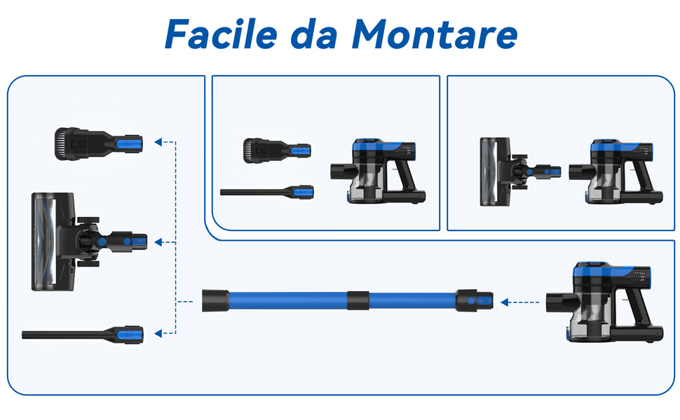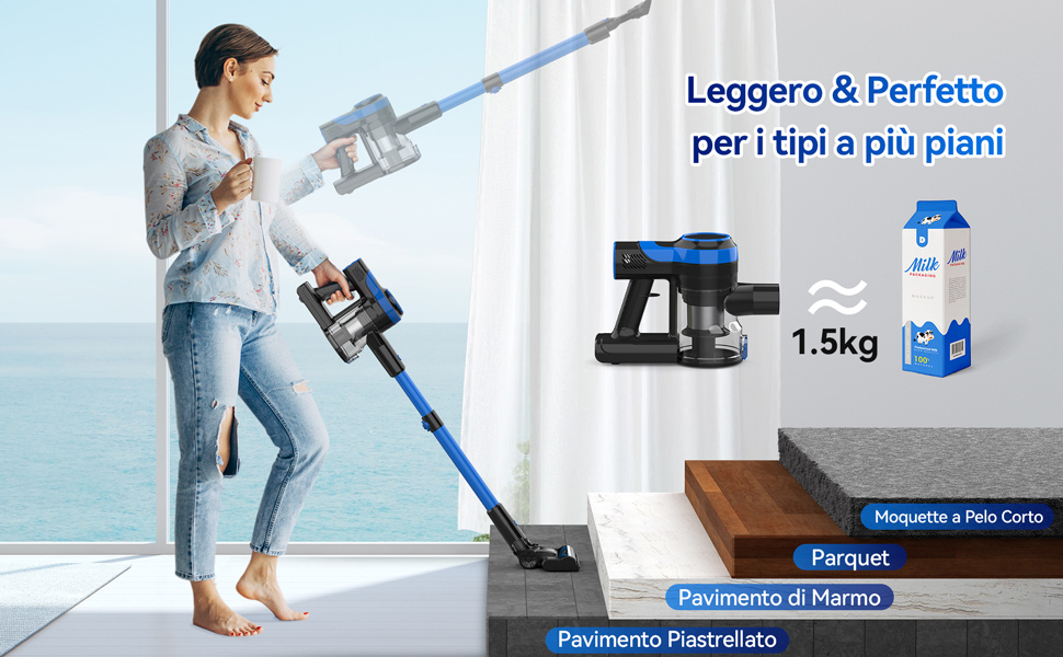 Informazioni su questo articolo 【Aspirazione Potente & Super Silenzioso】L'aspirapolvere senza fili con potente motore da 200W e 2 modalità di aspirazione, fornisce 20Kpa di potenza di aspirazione in modalità massima, raccogliere polvere, detriti e capelli da varie superfici è un gioco da ragazzi. L'aspirapolvere è anche abbastanza silenzioso, con un livello di rumore di circa 60dB che non disturberà i tuoi coinquilini, animali domestici o vicini. 【5 Stadi Sistema di Filtraggio】Questo aspirapolvere senza fili, combinato con un avanzato sistema di filtraggio HEPA a 5 stadi completamente sigillato e tecnologia Cyclone, può intrappolare oltre il 99,99% di polvere e allergeni durante la pulizia, catturando tutte le particelle che ti fanno tossire e starnutire all'interno. 【Ultraleggero Aspirapolvere】Questo aspirapolvere leggero pesa solo 3kg, il che lo rende estremamente adatto per la pulizia con una sola mano e l'aspirapolvere è autoportante e può essere collocato ovunque si desideri. L'aspirapolvere senza fili elimina il fastidio dei cavi, rendendolo facile da trasportare da una stanza all'altra, funzionando perfettamente su pavimenti duri, piastrelle, pavimenti in legno, moquette e tappetini. 【40 Mins Autonomia】L'aspirapolvere senza filo ricaricabile contiene una batteria 6x2200 di grande capacità, una singola carica può durare fino a 40 minuti in modalità standard e, una volta completamente carica, può durare fino a 40 minuti in modalità standard. Una singola carica ti consente di aspirare ogni stanza di tutta la casa.Con un contenitore per la polvere grande da 1 litro, puoi svuotare facilmente il contenitore della spazzatura premendo un solo pulsante. 【6 in 1 Aspirapolvere Versatile】 questo versatile aspirapolvere può essere trasformato in un aspirapolvere portatile. Puoi anche estendere il tubo regolabile per pulire rapidamente le tende impolverate e rimuovere le ragnatele dagli angoli del soffitto. Puoi anche utilizzare la spazzola 2 in 1 inclusa o la bocchetta per fessure, che ti consente di accedere alle aree difficili da raggiungere e alla polvere, o di pulire i peli dal divano del tuo bambino in pelliccia. › Visualizza altri dettagli prodotto Informazioni su questo articolo 【Aspirazione Potente & Super Silenzioso】L'aspirapolvere senza fili con potente motore da 200W e 2 modalità di aspirazione, fornisce 20Kpa di potenza di aspirazione in modalità massima, raccogliere polvere, detriti e capelli da varie superfici è un gioco da ragazzi. L'aspirapolvere è anche abbastanza silenzioso, con un livello di rumore di circa 60dB che non disturberà i tuoi coinquilini, animali domestici o vicini. 【5 Stadi Sistema di Filtraggio】Questo aspirapolvere senza fili, combinato con un avanzato sistema di filtraggio HEPA a 5 stadi completamente sigillato e tecnologia Cyclone, può intrappolare oltre il 99,99% di polvere e allergeni durante la pulizia, catturando tutte le particelle che ti fanno tossire e starnutire all'interno. 【Ultraleggero Aspirapolvere】Questo aspirapolvere leggero pesa solo 3kg, il che lo rende estremamente adatto per la pulizia con una sola mano e l'aspirapolvere è autoportante e può essere collocato ovunque si desideri. L'aspirapolvere senza fili elimina il fastidio dei cavi, rendendolo facile da trasportare da una stanza all'altra, funzionando perfettamente su pavimenti duri, piastrelle, pavimenti in legno, moquette e tappetini. 【40 Mins Autonomia】L'aspirapolvere senza filo ricaricabile contiene una batteria 6x2200 di grande capacità, una singola carica può durare fino a 40 minuti in modalità standard e, una volta completamente carica, può durare fino a 40 minuti in modalità standard. Una singola carica ti consente di aspirare ogni stanza di tutta la casa.Con un contenitore per la polvere grande da 1 litro, puoi svuotare facilmente il contenitore della spazzatura premendo un solo pulsante. 【6 in 1 Aspirapolvere Versatile】 questo versatile aspirapolvere può essere trasformato in un aspirapolvere portatile. Puoi anche estendere il tubo regolabile per pulire rapidamente le tende impolverate e rimuovere le ragnatele dagli angoli del soffitto. Puoi anche utilizzare la spazzola 2 in 1 inclusa o la bocchetta per fessure, che ti consente di accedere alle aree difficili da raggiungere e alla polvere, o di pulire i peli dal divano del tuo bambino in pelliccia. › Visualizza altri dettagli prodotto Product details