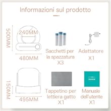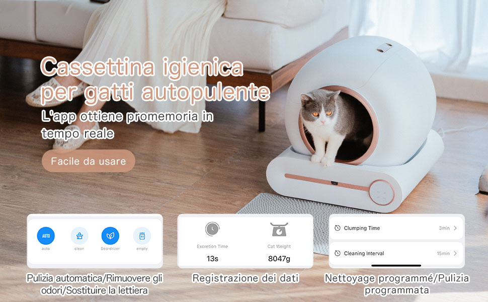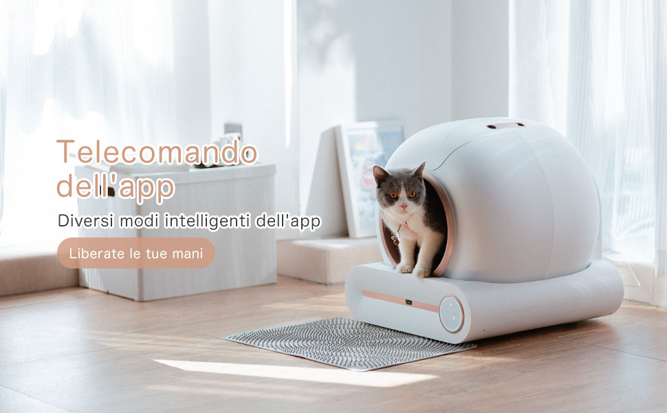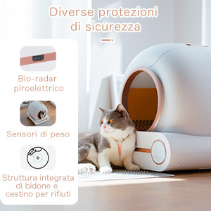 Informazioni su questo articolo [Pulizia Automatica] La lettiera automatica per gatti può rilevare automaticamente l'ingresso e l'uscita degli animali domestici e pulirla automaticamente. La lettiera gatto chiusa è dotata di un bidone dei rifiuti da 9L, che può soddisfare le esigenze di stoccaggio dei rifiuti delle famiglie con due gatti per una settimana! Nessuna pala! La pulizia della lettiera autopulente robot è senza sforzo. Ha solo due parti: il barile e la base. Il montaggio e lo smontaggio sono molto semplici. [Controllo Smart App] La lettiera autopulente per gatti multipli può essere collegata alla rete (solo WiFi 2,4GHz, non supporta WiFi 5GHz) per il controllo remoto tramite un'app. Monitora e gestisci la lettiere autopulenti gatti in qualsiasi momento e ovunque, con funzionalità come il monitoraggio della frequenza d'uso, la verifica dello stato di auto-pulizia e modalità personalizzabili per la pulizia programmata, la rimozione degli odori e la sostituzione della lettiera. [Capacità Grande 65L] Il nostro design a forma di cerchio può offrire molto più spazio ai gatti rispetto a una normale scatola. L'ampio spazio interno (lato interno da 65L) fornisce uno spazio confortevole per i gatti e il grande bidone dei rifiuti (9L) è abbastanza grande da contenere più lettiera per gatti. Le ampie lettiera per gatti chiusa hanno abbastanza spazio per ospitare gatti con un peso compreso tra 1 kg e 8 kg. [Sensori Integrati] Dotato di quattro set di sensori di peso, il toilette per gatti autopulente può funzionare con precisione ed evitare di ferire i gatti. La pulizia automatica inizia automaticamente 3 minuti dopo che il gatto esce e può essere reimpostata nell'app se necessario. Il processo di pulizia si interrompe se un gatto interviene mentre è in corso. La lettiera gatto grande risponde con precisione alle condizioni mutevoli, garantendo la sicurezza del tuo gatto. [Rimozione degli Odori] Essendo un contenitore chiuso, il controllo degli odori è essenziale per una lettiera autopulente elettrica. La deodorizzazione ionica integrata è sicura e non tossica, e il trattamento deodorante e antibatterico viene eseguito automaticamente dopo ogni pulizia per mantenere l'aria fresca e creare un ambiente confortevole per il tuo gatto. › Visualizza altri dettagli prodotto Informazioni su questo articolo [Pulizia Automatica] La lettiera automatica per gatti può rilevare automaticamente l'ingresso e l'uscita degli animali domestici e pulirla automaticamente. La lettiera gatto chiusa è dotata di un bidone dei rifiuti da 9L, che può soddisfare le esigenze di stoccaggio dei rifiuti delle famiglie con due gatti per una settimana! Nessuna pala! La pulizia della lettiera autopulente robot è senza sforzo. Ha solo due parti: il barile e la base. Il montaggio e lo smontaggio sono molto semplici. [Controllo Smart App] La lettiera autopulente per gatti multipli può essere collegata alla rete (solo WiFi 2,4GHz, non supporta WiFi 5GHz) per il controllo remoto tramite un'app. Monitora e gestisci la lettiere autopulenti gatti in qualsiasi momento e ovunque, con funzionalità come il monitoraggio della frequenza d'uso, la verifica dello stato di auto-pulizia e modalità personalizzabili per la pulizia programmata, la rimozione degli odori e la sostituzione della lettiera. [Capacità Grande 65L] Il nostro design a forma di cerchio può offrire molto più spazio ai gatti rispetto a una normale scatola. L'ampio spazio interno (lato interno da 65L) fornisce uno spazio confortevole per i gatti e il grande bidone dei rifiuti (9L) è abbastanza grande da contenere più lettiera per gatti. Le ampie lettiera per gatti chiusa hanno abbastanza spazio per ospitare gatti con un peso compreso tra 1 kg e 8 kg. [Sensori Integrati] Dotato di quattro set di sensori di peso, il toilette per gatti autopulente può funzionare con precisione ed evitare di ferire i gatti. La pulizia automatica inizia automaticamente 3 minuti dopo che il gatto esce e può essere reimpostata nell'app se necessario. Il processo di pulizia si interrompe se un gatto interviene mentre è in corso. La lettiera gatto grande risponde con precisione alle condizioni mutevoli, garantendo la sicurezza del tuo gatto. [Rimozione degli Odori] Essendo un contenitore chiuso, il controllo degli odori è essenziale per una lettiera autopulente elettrica. La deodorizzazione ionica integrata è sicura e non tossica, e il trattamento deodorante e antibatterico viene eseguito automaticamente dopo ogni pulizia per mantenere l'aria fresca e creare un ambiente confortevole per il tuo gatto. › Visualizza altri dettagli prodotto Product details
