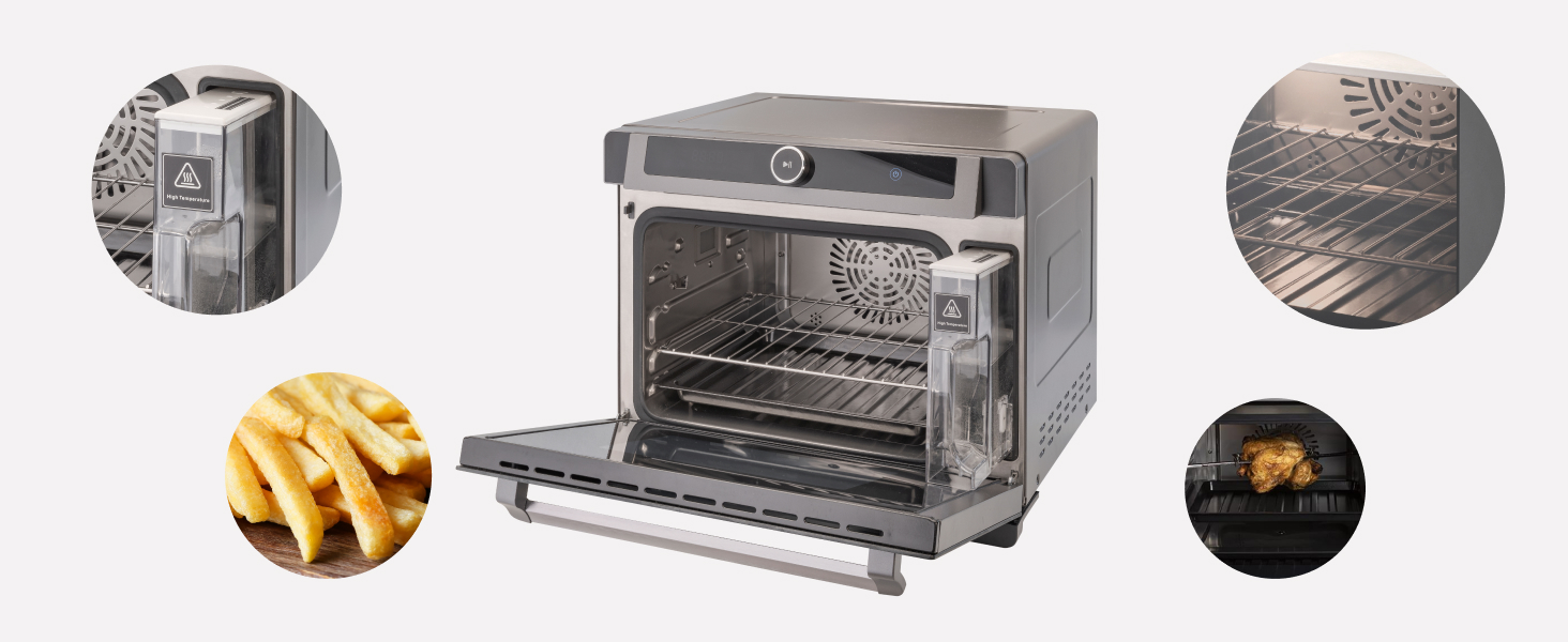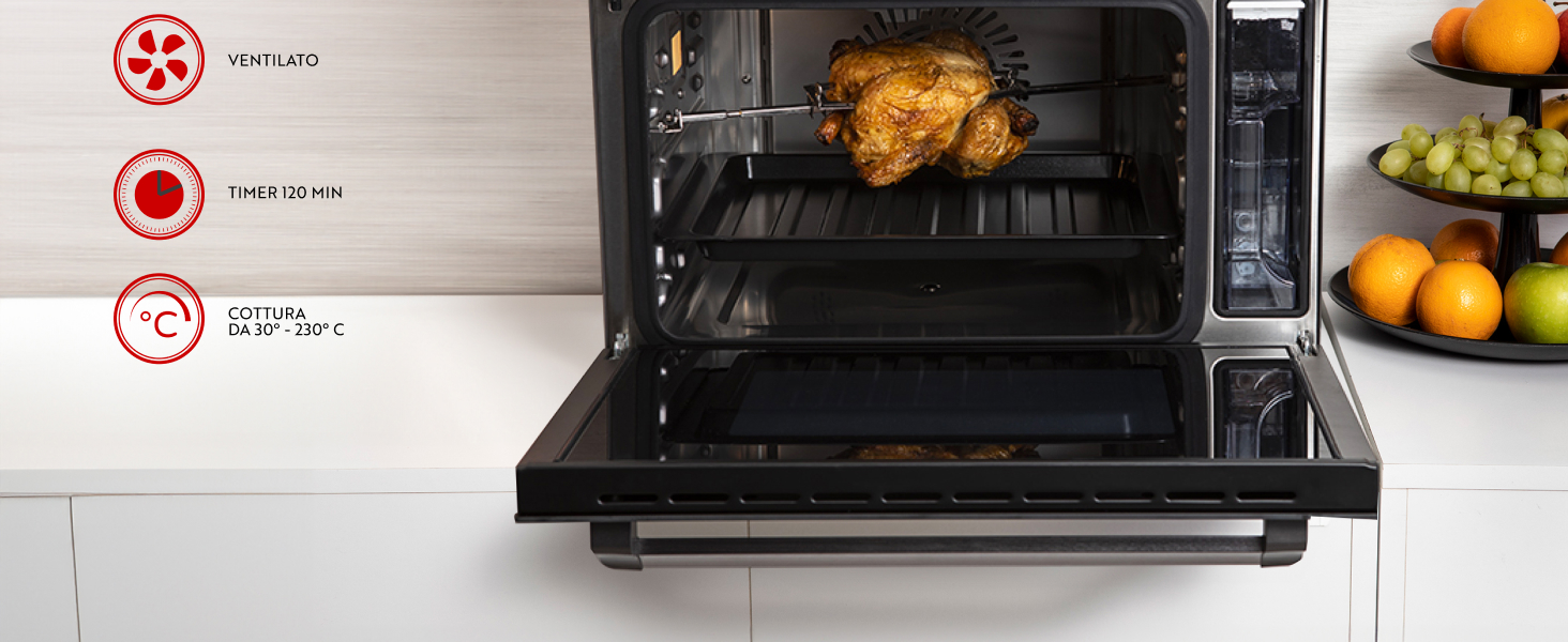 Informazioni su questo articolo [PROGRAMMABILE] Programmi di cottura: al vapore, al forno + vapore, al forno statica e/o ventilata, in frittura senza immergere in olio, a bassa temperatura. 31 programmi preimpostati. Programmi a temperature basse per tenere al caldo, scongelare, fermentare e deidratare. [FUNZIONALE] Dispone di luce interna, funzione Child-Lock e cicli di pulizia e decalcificazione con vapore. E' possibile rimuovere il vetro interno e pulire tra i due vetri. [FACILE DA USARE] Comandi elettronici (display con tempo, temperatura e le funzioni), Termostato 30°- 230°C, Interruttore di sicurezza (all’apertura dello sportello si interrompono le funzioni), Timer (2h max). [COMPLETO] Accessori inclusi: Girarrosti inox con impugnatura, griglia inox, teglia, vassoio raccolta liquidi, guanto. [RESISTENTE] Pareti interne, grigli e girarrosto in acciaio inox. Luce interna. › Visualizza altri dettagli prodotto Informazioni su questo articolo [PROGRAMMABILE] Programmi di cottura: al vapore, al forno + vapore, al forno statica e/o ventilata, in frittura senza immergere in olio, a bassa temperatura. 31 programmi preimpostati. Programmi a temperature basse per tenere al caldo, scongelare, fermentare e deidratare. [FUNZIONALE] Dispone di luce interna, funzione Child-Lock e cicli di pulizia e decalcificazione con vapore. E' possibile rimuovere il vetro interno e pulire tra i due vetri. [FACILE DA USARE] Comandi elettronici (display con tempo, temperatura e le funzioni), Termostato 30°- 230°C, Interruttore di sicurezza (all’apertura dello sportello si interrompono le funzioni), Timer (2h max). [COMPLETO] Accessori inclusi: Girarrosti inox con impugnatura, griglia inox, teglia, vassoio raccolta liquidi, guanto. [RESISTENTE] Pareti interne, grigli e girarrosto in acciaio inox. Luce interna. › Visualizza altri dettagli prodotto Product details