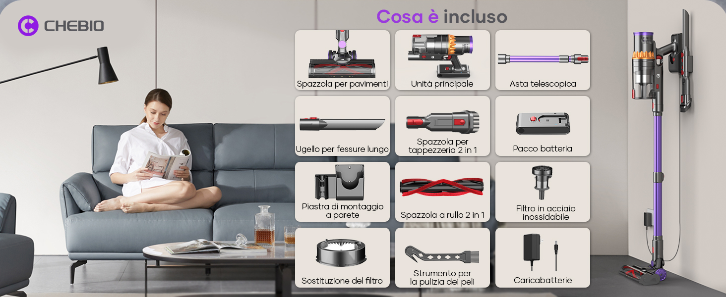 Marchio CHEBIO Colore Purple Dimensioni del collo 45 x 27 x 18,6 cm; 2,7 kg Capacità 1,5 Litri Wattaggio 550 watt Classe di prestazione di pulizia su tappeti A Classe di prestazione di pulizia su pavimenti A Classe di re-emissione della polvere A Rumorosità 65 dB Autonomia 1 ora e 10 minuti Caratteristiche speciali Modalità automatica (regolazione automatica della potenza di aspirazione), Motore senza spazzole ad alta velocità da 550W/45Kpa, 3 livelli di potenza di aspirazione, Schermo LED Smart Touch, 70 minuti di autonomia, Spazzole anti-groviglio, Ricarica rapida in 4 ore, Capacità della polvere di 1,5L, Batteria rimovibile, Sistema di filtraggio a ciclone, Tubo telescopico, Svuotamento con un solo tocco, Spazzola per pavimenti girevole a 270° con luce anteriore Peso articolo 2,7 Kilograms -
