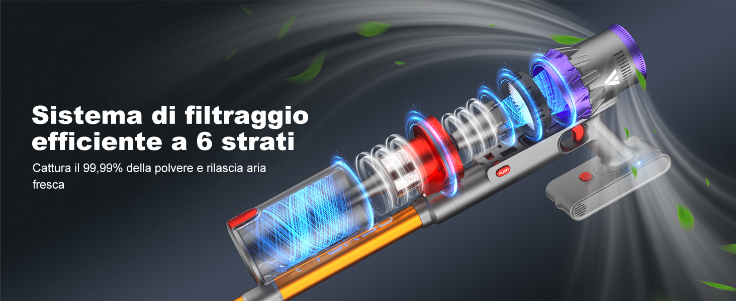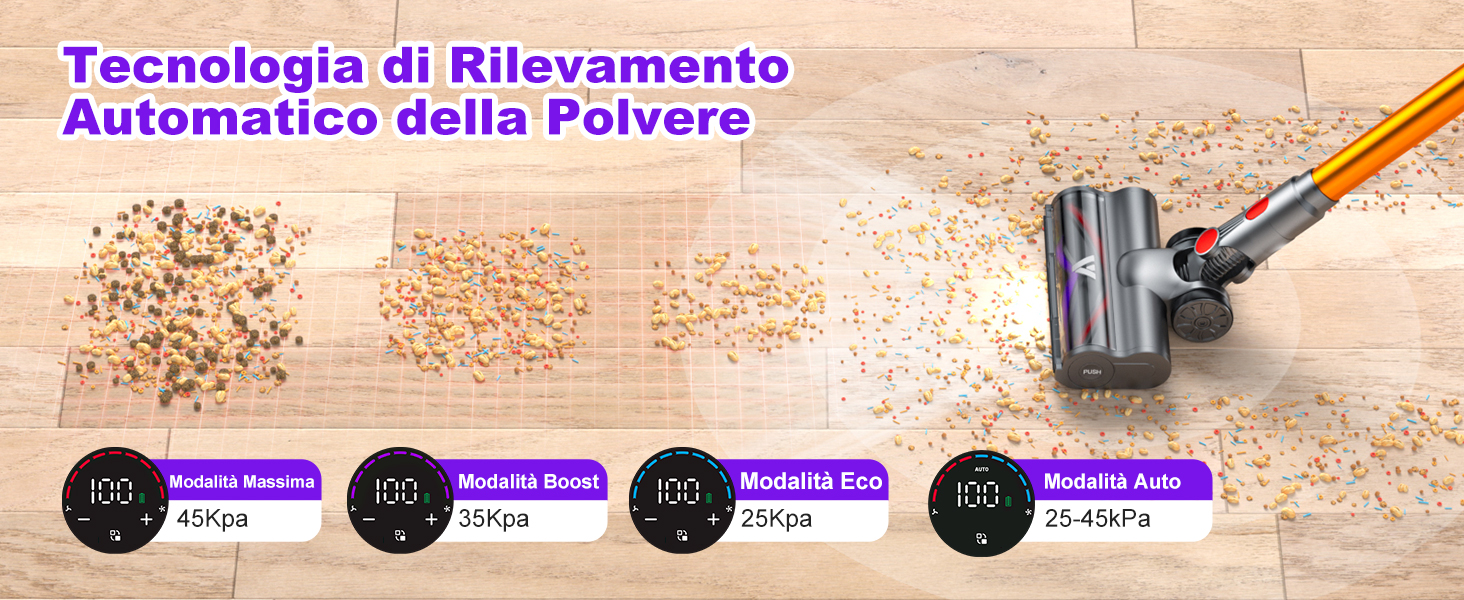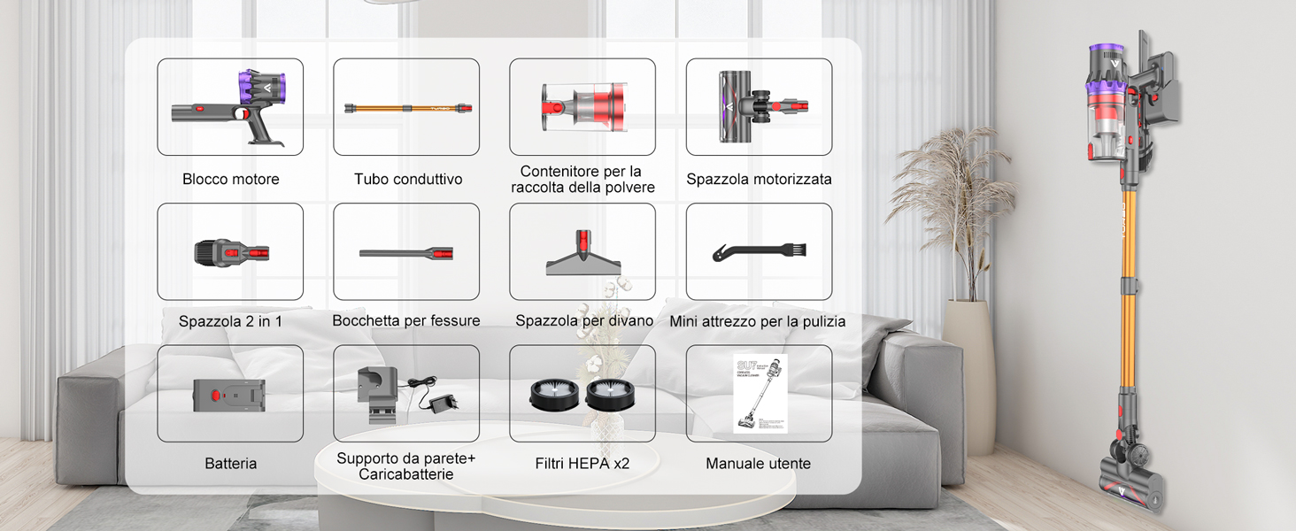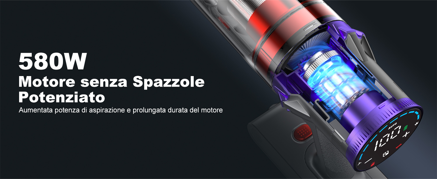 Informazioni su questo articolo 45Kpa di Potenza di Aspirazione, Motore Brushless da 580W: L'aspirapolvere senza fili coovy è dotato di un motore senza spazzole da 580W che fornisce una potente aspirazione di 45Kpa. Rimuove facilmente polvere e peli di animali, adatto per pavimenti duri e tappeti. Batteria da 8*2500mAh, Fino a 70 Minuti di Autonomia: La scopa elettrica senza filo è dotato di 29,6V 8 batterie ad alta densità da 2500mAh. In modalità AUTO e ECO, l'autonomia massima è di 70 minuti, in modalità MAX, fino a 20 minuti. Basta riporre l'aspirapolvere nel supporto a parete per una ricarica comoda e veloce, con un tempo di ricarica di soli 4-5 ore. 4 Livelli di Aspirazione, Sensore della Polvere Automatico: Il SU7 ha una modalità automatica e 3 modalità di aspirazione fissi. In modalità automatica, l'aspirapolvere regola automaticamente la potenza di aspirazione in base alla quantità di polvere per risparmiare energia. La massima potenza di aspirazione è di 45Kpa, rimuovendo facilmente sporco, detriti, polvere, briciole e peli di animali. Spazzola Anti-Groviglio a V Aggiornata: L'aspirapolvere senza fili potente ha una spazzola anti-groviglio a V aggiornata, che combina setole morbide e dure per ridurre efficacemente l'aggrovigliamento dei capelli. La spazzola per pavimenti può ruotare liberamente a 180° e 270°, pulendo ogni angolo. La spazzola per pavimenti è inoltre dotata di luci LED per illuminare le aree scure sotto il letto e il divano. Schermo Touch LED Intelligente: Include un touchscreen di maggiori dimensioni (diametro 90 mm). Utilizzando lo schermo touch, è possibile regolare facilmente la potenza di aspirazione e passare alla modalità automatica con un solo tocco. Lo schermo touch mostra in tempo reale lo stato di funzionamento e la batteria residua, rendendo facile il monitoraggio dell'utilizzo. L'anello luminoso mostra colori diversi a seconda della potenza di aspirazione. Sistema di Filtrazione a 6 Stadi & Contenitore per la Polvere da 1,3L: SU7 è dotato di un sistema di filtrazione a 6 stadi che cattura efficacemente il 99,99% delle particelle fini e dei peli di animali, purificando l'aria interna. Il contenitore per la polvere da 1,3L può essere svuotato con un solo tocco, senza sporcare le mani. Assistenza Clienti Senza Preoccupazioni: Coovy offre una garanzia di 2 anni sul prodotto e promette un supporto clienti 24/7. Se durante l'uso incontri problemi, contattaci in qualsiasi momento e risolveremo il tuo problema il prima possibile. › Visualizza altri dettagli prodotto Informazioni su questo articolo 45Kpa di Potenza di Aspirazione, Motore Brushless da 580W: L'aspirapolvere senza fili coovy è dotato di un motore senza spazzole da 580W che fornisce una potente aspirazione di 45Kpa. Rimuove facilmente polvere e peli di animali, adatto per pavimenti duri e tappeti. Batteria da 8*2500mAh, Fino a 70 Minuti di Autonomia: La scopa elettrica senza filo è dotato di 29,6V 8 batterie ad alta densità da 2500mAh. In modalità AUTO e ECO, l'autonomia massima è di 70 minuti, in modalità MAX, fino a 20 minuti. Basta riporre l'aspirapolvere nel supporto a parete per una ricarica comoda e veloce, con un tempo di ricarica di soli 4-5 ore. 4 Livelli di Aspirazione, Sensore della Polvere Automatico: Il SU7 ha una modalità automatica e 3 modalità di aspirazione fissi. In modalità automatica, l'aspirapolvere regola automaticamente la potenza di aspirazione in base alla quantità di polvere per risparmiare energia. La massima potenza di aspirazione è di 45Kpa, rimuovendo facilmente sporco, detriti, polvere, briciole e peli di animali. Spazzola Anti-Groviglio a V Aggiornata: L'aspirapolvere senza fili potente ha una spazzola anti-groviglio a V aggiornata, che combina setole morbide e dure per ridurre efficacemente l'aggrovigliamento dei capelli. La spazzola per pavimenti può ruotare liberamente a 180° e 270°, pulendo ogni angolo. La spazzola per pavimenti è inoltre dotata di luci LED per illuminare le aree scure sotto il letto e il divano. Schermo Touch LED Intelligente: Include un touchscreen di maggiori dimensioni (diametro 90 mm). Utilizzando lo schermo touch, è possibile regolare facilmente la potenza di aspirazione e passare alla modalità automatica con un solo tocco. Lo schermo touch mostra in tempo reale lo stato di funzionamento e la batteria residua, rendendo facile il monitoraggio dell'utilizzo. L'anello luminoso mostra colori diversi a seconda della potenza di aspirazione. Sistema di Filtrazione a 6 Stadi & Contenitore per la Polvere da 1,3L: SU7 è dotato di un sistema di filtrazione a 6 stadi che cattura efficacemente il 99,99% delle particelle fini e dei peli di animali, purificando l'aria interna. Il contenitore per la polvere da 1,3L può essere svuotato con un solo tocco, senza sporcare le mani. Assistenza Clienti Senza Preoccupazioni: Coovy offre una garanzia di 2 anni sul prodotto e promette un supporto clienti 24/7. Se durante l'uso incontri problemi, contattaci in qualsiasi momento e risolveremo il tuo problema il prima possibile. › Visualizza altri dettagli prodotto Product details