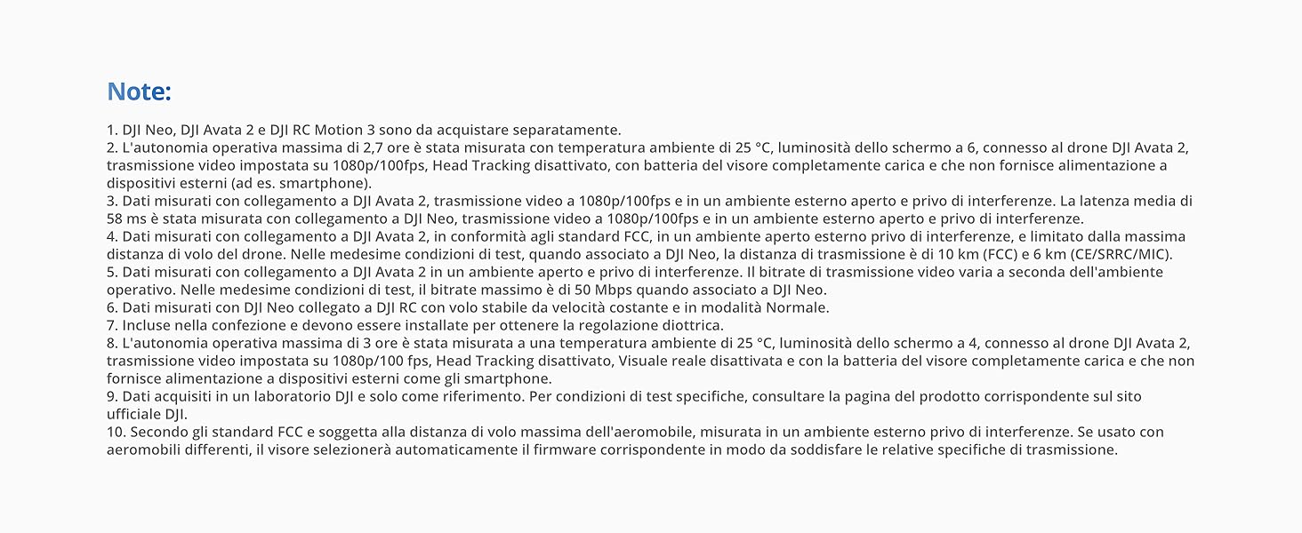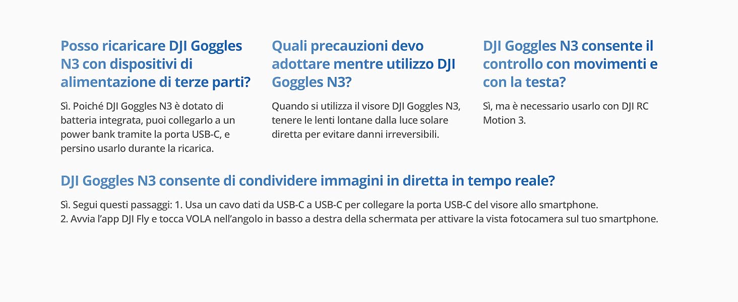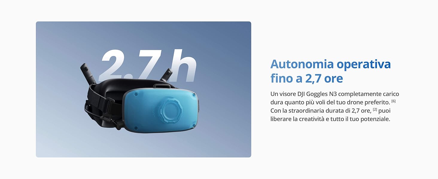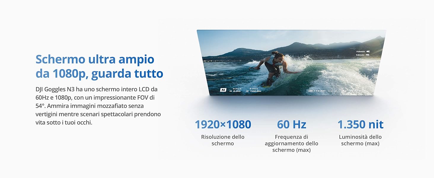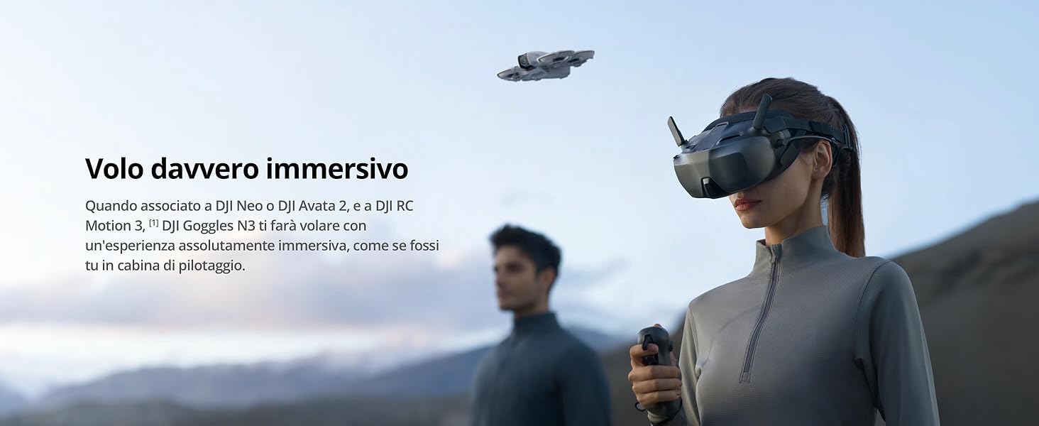 Attraversa il cielo - Vivi un'esperienza di volo immersiva con RC Motion 3, DJI Neo e droni FPV come DJI Avata 2, [1] per una visibilità più ampia del tuo volo grazie allo schermo ultra ampio da 1080p. Pronto al decollo - Goggles N3 è dotato di un ampio spazio interno per indossare comodamente gli occhiali, senza la necessità di regolazione diottrica o inserimento di lenti. Semplicemente, indossalo e vai. Visione senza paragoni - DJI Goggles N3 è dotato di schermo LCD da 60Hz e 1080p e di un impressionante FOV di 54°. Ammira immagini mozzafiato senza vertigini mentre scenari spettacolari prendono vita sotto i tuoi occhi. Trasmissione delle immagini potente e affidabile - La trasmissione video digitale avanzata DJI O4 offre eccezionali prestazioni anti-interferenza con immagini in streaming a 1080p/60fps, latenza ultra bassa di 31 ms [3] e distanza fino a 13 km. [4] Controllo semplice e intuitivo - DJI RC Motion 3 [1] può essere utilizzato come cursore AR prima del decollo del drone, o quando staziona in volo dopo aver frenato, consentendoti di gestire con facilità funzioni e impostazioni. Ricarica di meno, vola più a lungo - Quando completamente carico, il visore DJI Goggles N3 offre l'eccezionale durata operativa di 2,7 ore, [2] il tempo che ti serve per liberare la tua voglia creativa e tutto il tuo potenziale. Compatibilità - Compatibile con DJI Avata 2, DJI Neo, Serie DJI O4 Air Unit, DJI RC Motion 3 e DJI FPV Remote Controller 3. Si noti che il visore Goggles N3 non è compatibile con l'uso di DJI RC Motion 2, DJI FPV Remote Controller 2, DJI RC-N3 e DJI RC 2. › Visualizza altri dettagli prodotto Attraversa il cielo - Vivi un'esperienza di volo immersiva con RC Motion 3, DJI Neo e droni FPV come DJI Avata 2, [1] per una visibilità più ampia del tuo volo grazie allo schermo ultra ampio da 1080p. Pronto al decollo - Goggles N3 è dotato di un ampio spazio interno per indossare comodamente gli occhiali, senza la necessità di regolazione diottrica o inserimento di lenti. Semplicemente, indossalo e vai. Visione senza paragoni - DJI Goggles N3 è dotato di schermo LCD da 60Hz e 1080p e di un impressionante FOV di 54°. Ammira immagini mozzafiato senza vertigini mentre scenari spettacolari prendono vita sotto i tuoi occhi. Trasmissione delle immagini potente e affidabile - La trasmissione video digitale avanzata DJI O4 offre eccezionali prestazioni anti-interferenza con immagini in streaming a 1080p/60fps, latenza ultra bassa di 31 ms [3] e distanza fino a 13 km. [4] Controllo semplice e intuitivo - DJI RC Motion 3 [1] può essere utilizzato come cursore AR prima del decollo del drone, o quando staziona in volo dopo aver frenato, consentendoti di gestire con facilità funzioni e impostazioni. Ricarica di meno, vola più a lungo - Quando completamente carico, il visore DJI Goggles N3 offre l'eccezionale durata operativa di 2,7 ore, [2] il tempo che ti serve per liberare la tua voglia creativa e tutto il tuo potenziale. Compatibilità - Compatibile con DJI Avata 2, DJI Neo, Serie DJI O4 Air Unit, DJI RC Motion 3 e DJI FPV Remote Controller 3. Si noti che il visore Goggles N3 non è compatibile con l'uso di DJI RC Motion 2, DJI FPV Remote Controller 2, DJI RC-N3 e DJI RC 2. › Visualizza altri dettagli prodotto Product details