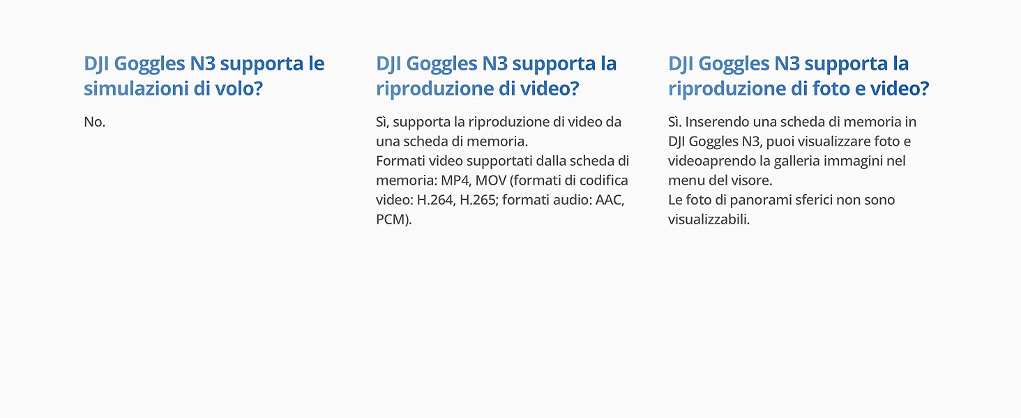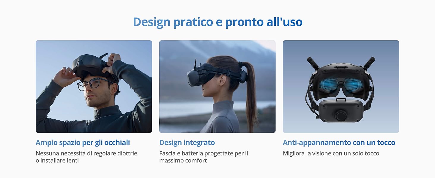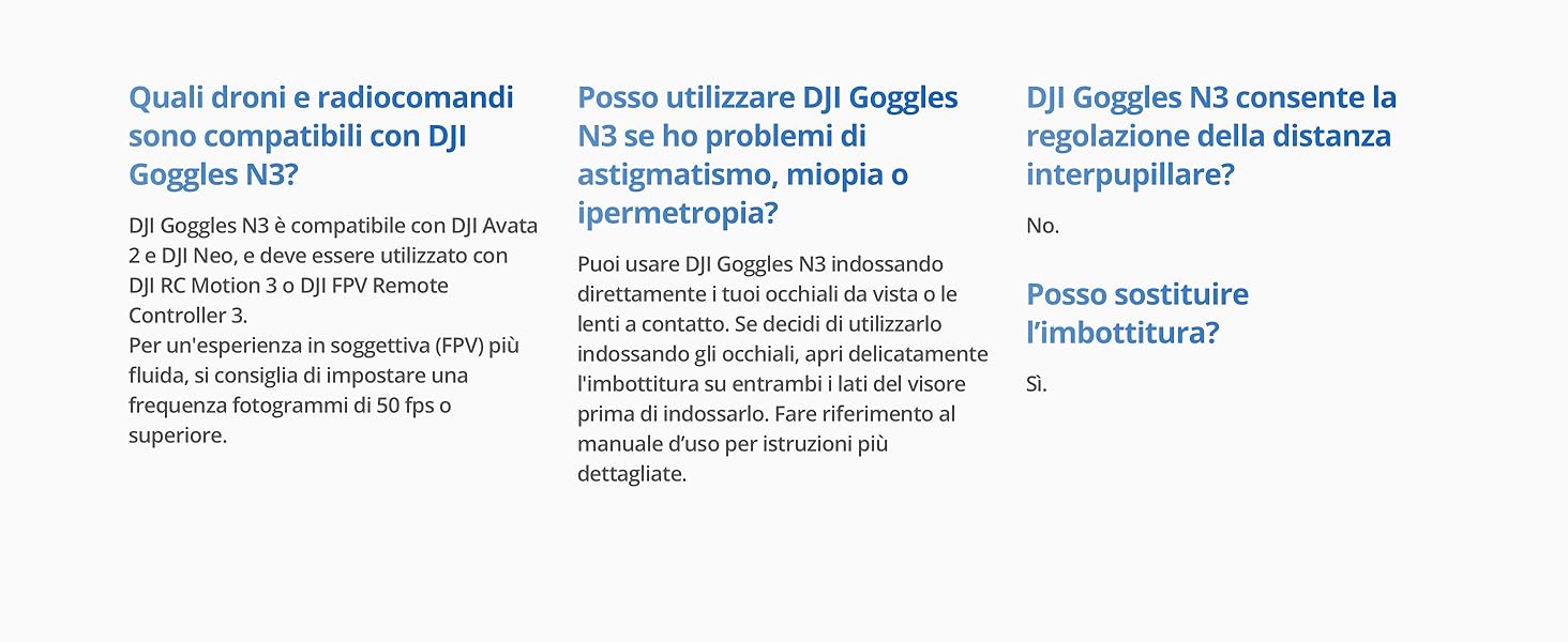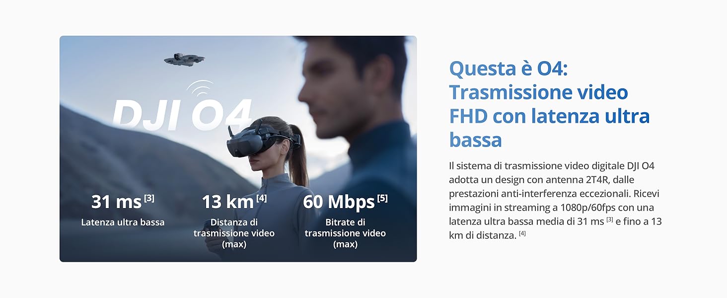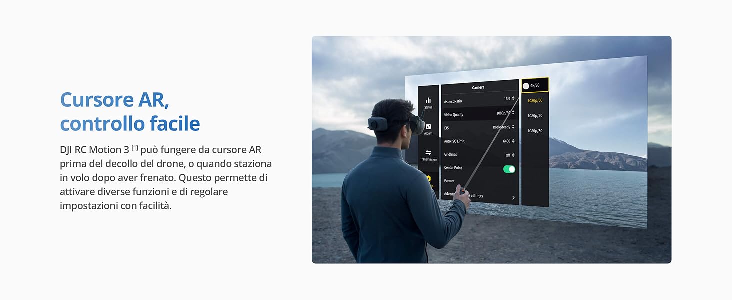 Attraversa il cielo - Vivi un'esperienza di volo immersiva con RC Motion 3, DJI Neo e droni FPV come DJI Avata 2, [1] per una visibilità più ampia del tuo volo grazie allo schermo ultra ampio da 1080p. Pronto al decollo - Goggles N3 è dotato di un ampio spazio interno per indossare comodamente gli occhiali, senza la necessità di regolazione diottrica o inserimento di lenti. Semplicemente, indossalo e vai. Visione senza paragoni - DJI Goggles N3 è dotato di schermo LCD da 60Hz e 1080p e di un impressionante FOV di 54°. Ammira immagini mozzafiato senza vertigini mentre scenari spettacolari prendono vita sotto i tuoi occhi. Trasmissione delle immagini potente e affidabile - La trasmissione video digitale avanzata DJI O4 offre eccezionali prestazioni anti-interferenza con immagini in streaming a 1080p/60fps, latenza ultra bassa di 31 ms [3] e distanza fino a 13 km. [4] Controllo semplice e intuitivo - DJI RC Motion 3 [1] può essere utilizzato come cursore AR prima del decollo del drone, o quando staziona in volo dopo aver frenato, consentendoti di gestire con facilità funzioni e impostazioni. Ricarica di meno, vola più a lungo - Quando completamente carico, il visore DJI Goggles N3 offre l'eccezionale durata operativa di 2,7 ore, [2] il tempo che ti serve per liberare la tua voglia creativa e tutto il tuo potenziale. Compatibilità - Compatibile con DJI Avata 2, DJI Neo, Serie DJI O4 Air Unit, DJI RC Motion 3 e DJI FPV Remote Controller 3. Si noti che il visore Goggles N3 non è compatibile con l'uso di DJI RC Motion 2, DJI FPV Remote Controller 2, DJI RC-N3 e DJI RC 2. › Visualizza altri dettagli prodotto Attraversa il cielo - Vivi un'esperienza di volo immersiva con RC Motion 3, DJI Neo e droni FPV come DJI Avata 2, [1] per una visibilità più ampia del tuo volo grazie allo schermo ultra ampio da 1080p. Pronto al decollo - Goggles N3 è dotato di un ampio spazio interno per indossare comodamente gli occhiali, senza la necessità di regolazione diottrica o inserimento di lenti. Semplicemente, indossalo e vai. Visione senza paragoni - DJI Goggles N3 è dotato di schermo LCD da 60Hz e 1080p e di un impressionante FOV di 54°. Ammira immagini mozzafiato senza vertigini mentre scenari spettacolari prendono vita sotto i tuoi occhi. Trasmissione delle immagini potente e affidabile - La trasmissione video digitale avanzata DJI O4 offre eccezionali prestazioni anti-interferenza con immagini in streaming a 1080p/60fps, latenza ultra bassa di 31 ms [3] e distanza fino a 13 km. [4] Controllo semplice e intuitivo - DJI RC Motion 3 [1] può essere utilizzato come cursore AR prima del decollo del drone, o quando staziona in volo dopo aver frenato, consentendoti di gestire con facilità funzioni e impostazioni. Ricarica di meno, vola più a lungo - Quando completamente carico, il visore DJI Goggles N3 offre l'eccezionale durata operativa di 2,7 ore, [2] il tempo che ti serve per liberare la tua voglia creativa e tutto il tuo potenziale. Compatibilità - Compatibile con DJI Avata 2, DJI Neo, Serie DJI O4 Air Unit, DJI RC Motion 3 e DJI FPV Remote Controller 3. Si noti che il visore Goggles N3 non è compatibile con l'uso di DJI RC Motion 2, DJI FPV Remote Controller 2, DJI RC-N3 e DJI RC 2. › Visualizza altri dettagli prodotto Product details