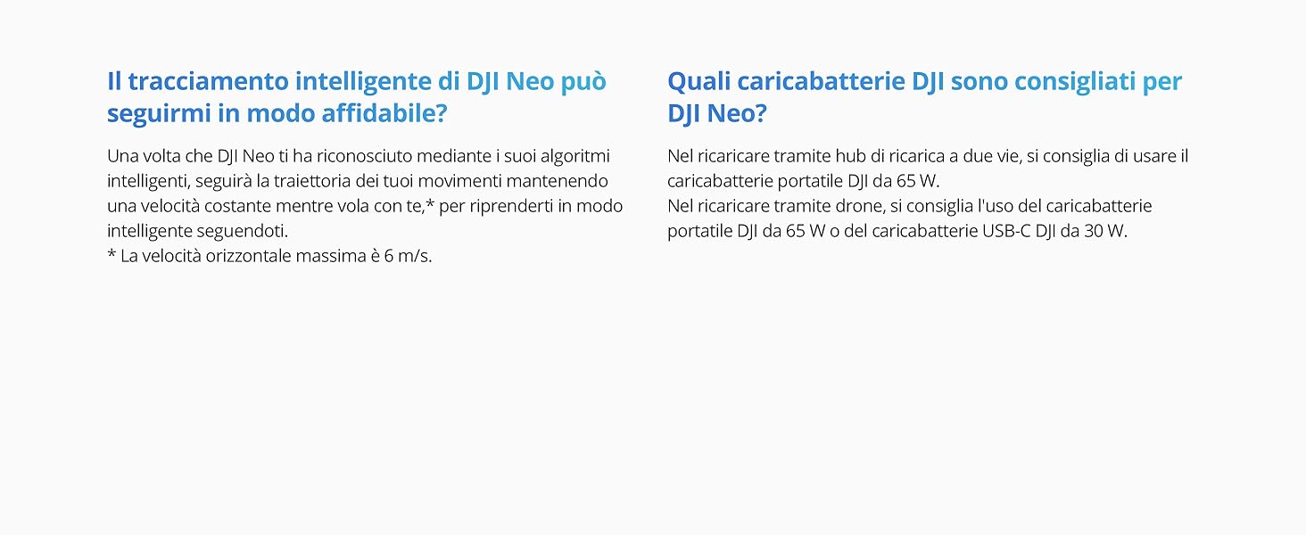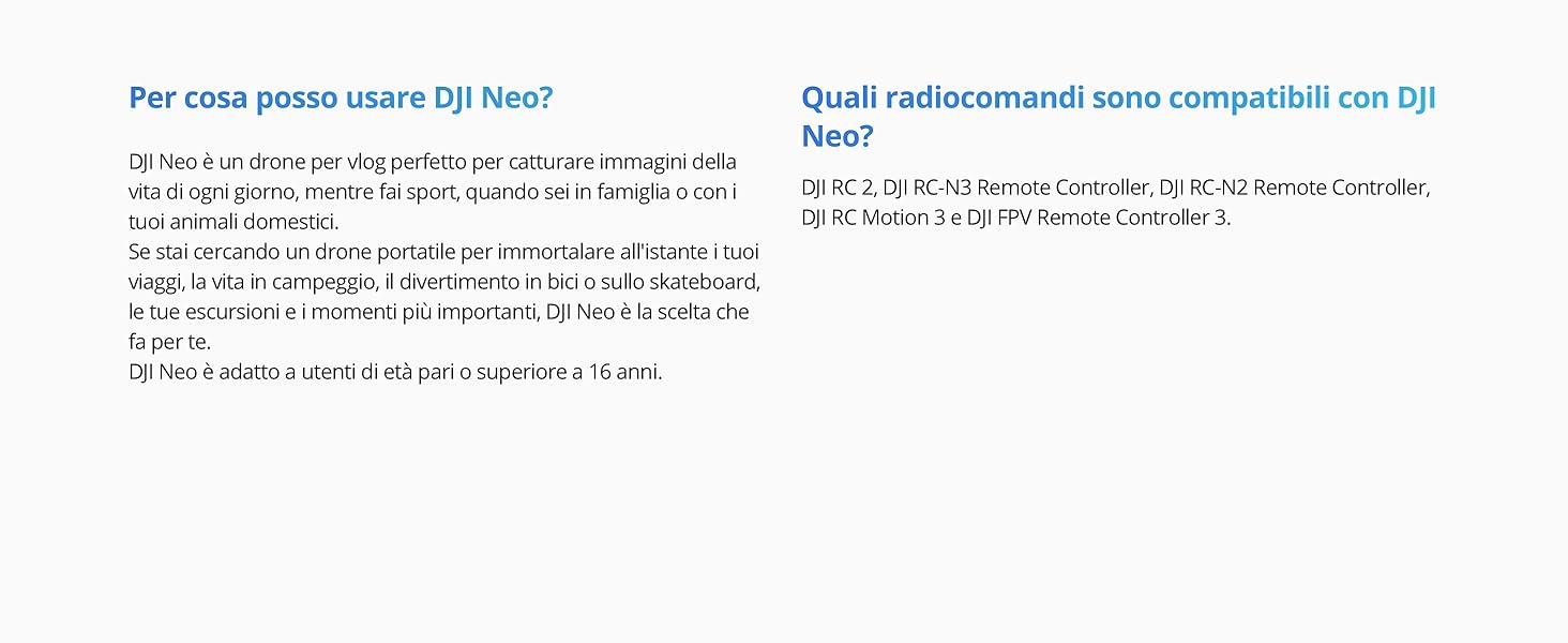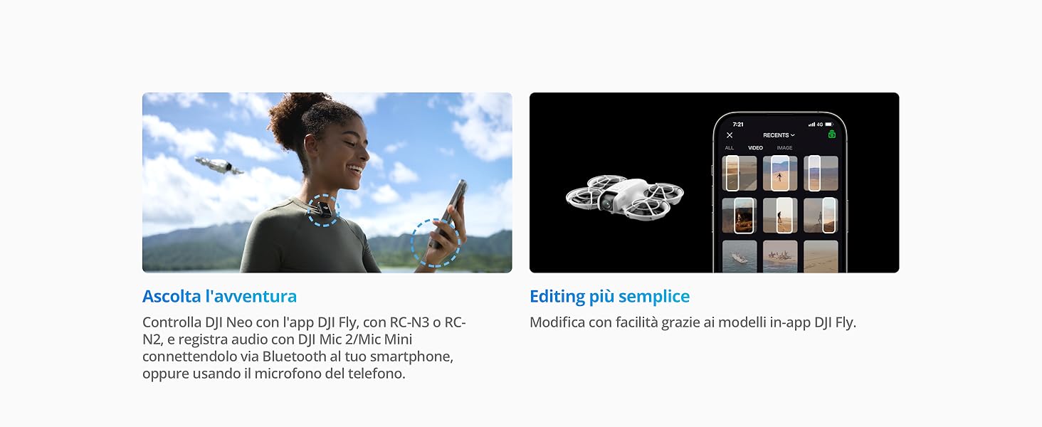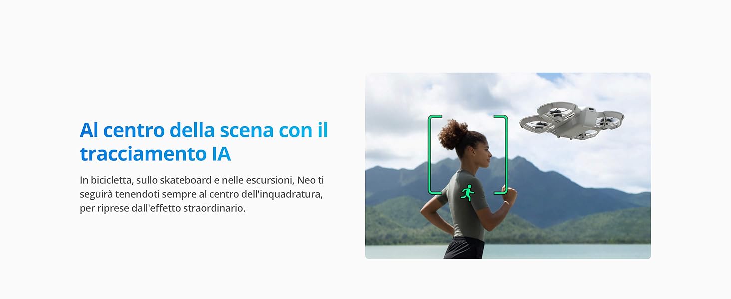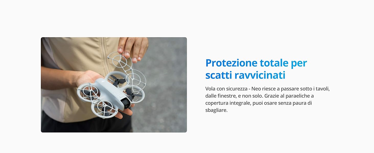 Informazioni su questo articolo Leggero e conforme alle normative - Neo è più leggero di molti smartphone! Mai più esami di certificazione: con soli 135 g di peso, Neo rientra nelle categorie A1 e A3 ed è conforme alla normativa C0. Decollo e atterraggio sul palmo della mano, vai senza radiocomando [1] - Neo decolla dalla tua mano solo premendo un pulsante. Sicuro e facile da usare, Neo è il compagno ideale per i tuoi BBQ in famiglia e le escursioni con gli amici. Tracciamento IA del soggetto e QuickShot - Registra facilmente vlog straordinari mentre DJI Neo ti segue con intelligenza. Filmare immagini professionali non è mai stato così facile, grazie alle otto modalità creative QuickShot! Diverse modalità di controllo, divertimento versatile - Fai volare Neo senza radiocomando, con i comandi vocali (inglese/cinese), usando l'app mobile oppure il radiocomando. Tante opzioni per far volare chiunque! Video ultra stabilizzati in 4K [8] - Nelle escursioni, in kayak, la tecnologia di stabilizzazione DJI, insieme alla resistenza al vento di livello e all'UHD 4K, ti garantiranno filmati fluidi e di alta qualità. Paraeliche integrale - Hai paura di volare? Ora non più! Sfreccia su e giù in casa e tra i rami degli alberi senza timori.* La versione standard di DJI Neo è dotata di batteria, paraeliche e tanto altro, pronta per volare senza radiocomando o con lo smartphone. › Visualizza altri dettagli prodotto Informazioni su questo articolo Leggero e conforme alle normative - Neo è più leggero di molti smartphone! Mai più esami di certificazione: con soli 135 g di peso, Neo rientra nelle categorie A1 e A3 ed è conforme alla normativa C0. Decollo e atterraggio sul palmo della mano, vai senza radiocomando [1] - Neo decolla dalla tua mano solo premendo un pulsante. Sicuro e facile da usare, Neo è il compagno ideale per i tuoi BBQ in famiglia e le escursioni con gli amici. Tracciamento IA del soggetto e QuickShot - Registra facilmente vlog straordinari mentre DJI Neo ti segue con intelligenza. Filmare immagini professionali non è mai stato così facile, grazie alle otto modalità creative QuickShot! Diverse modalità di controllo, divertimento versatile - Fai volare Neo senza radiocomando, con i comandi vocali (inglese/cinese), usando l'app mobile oppure il radiocomando. Tante opzioni per far volare chiunque! Video ultra stabilizzati in 4K [8] - Nelle escursioni, in kayak, la tecnologia di stabilizzazione DJI, insieme alla resistenza al vento di livello e all'UHD 4K, ti garantiranno filmati fluidi e di alta qualità. Paraeliche integrale - Hai paura di volare? Ora non più! Sfreccia su e giù in casa e tra i rami degli alberi senza timori.* La versione standard di DJI Neo è dotata di batteria, paraeliche e tanto altro, pronta per volare senza radiocomando o con lo smartphone. › Visualizza altri dettagli prodotto Product details