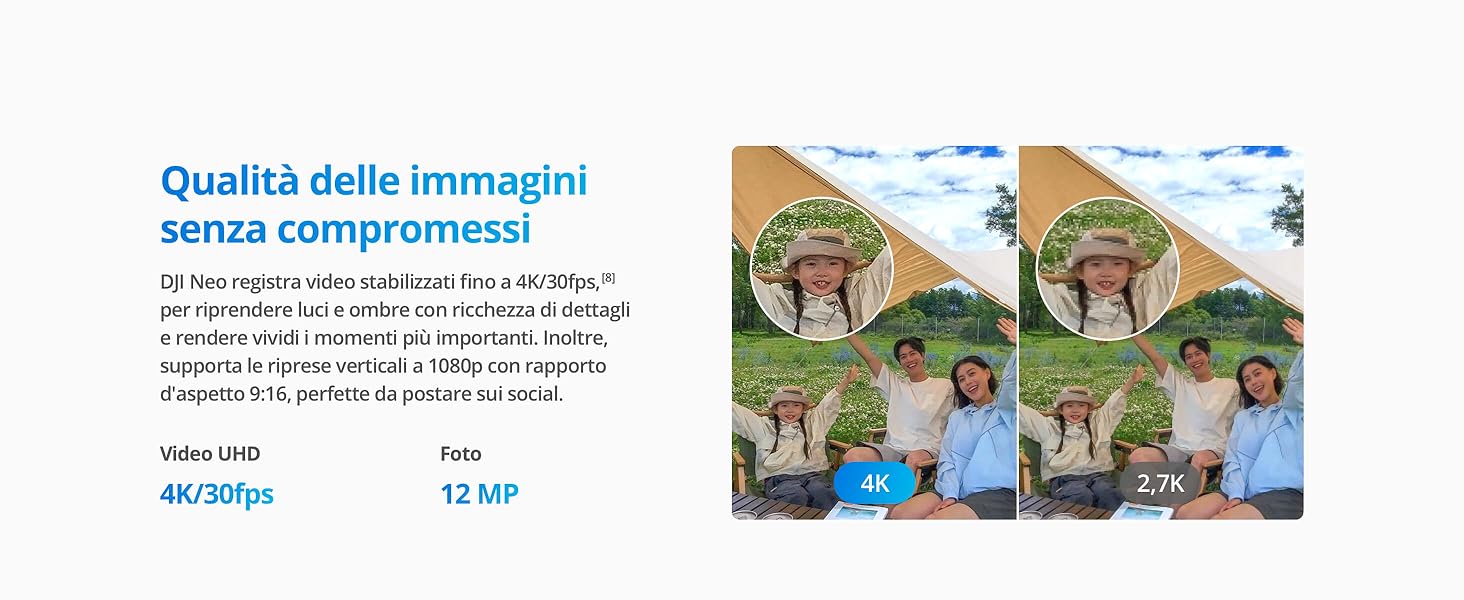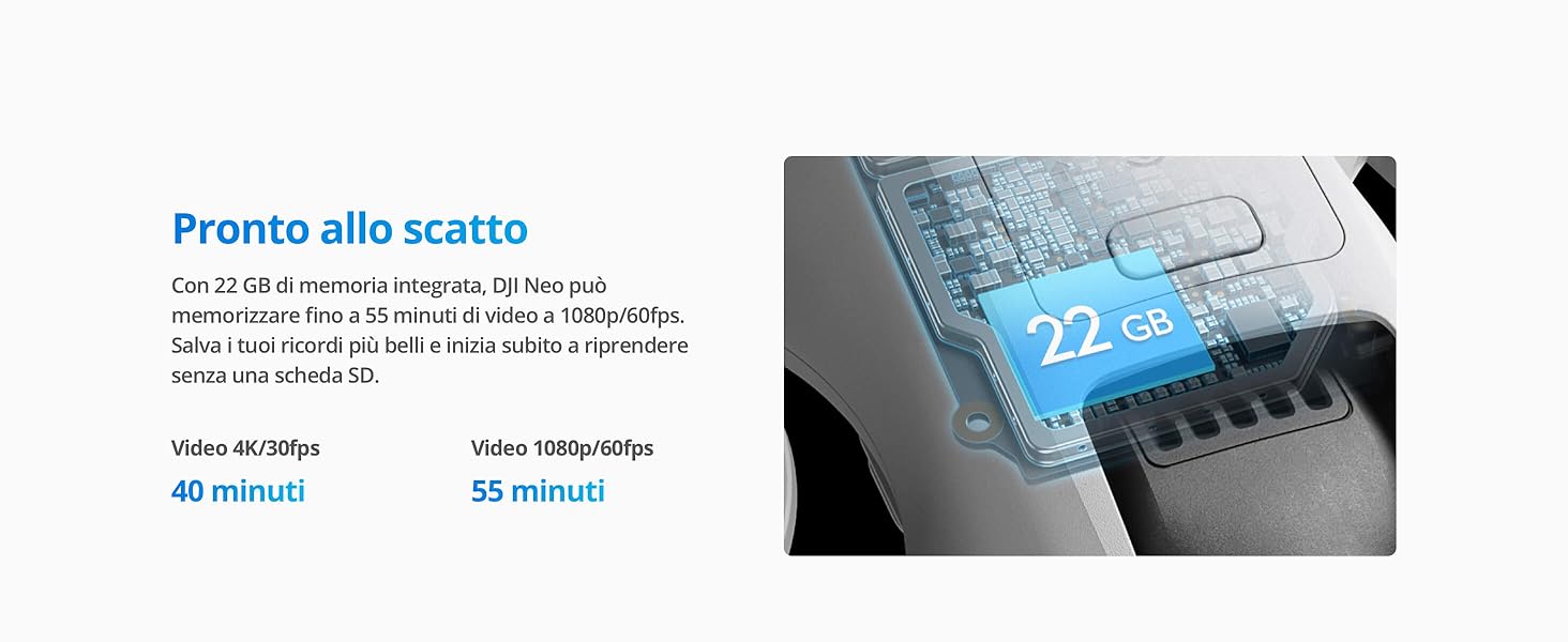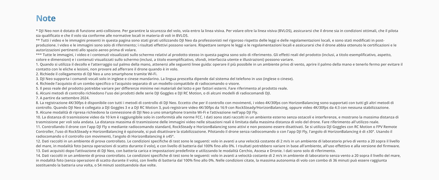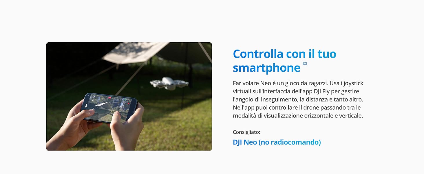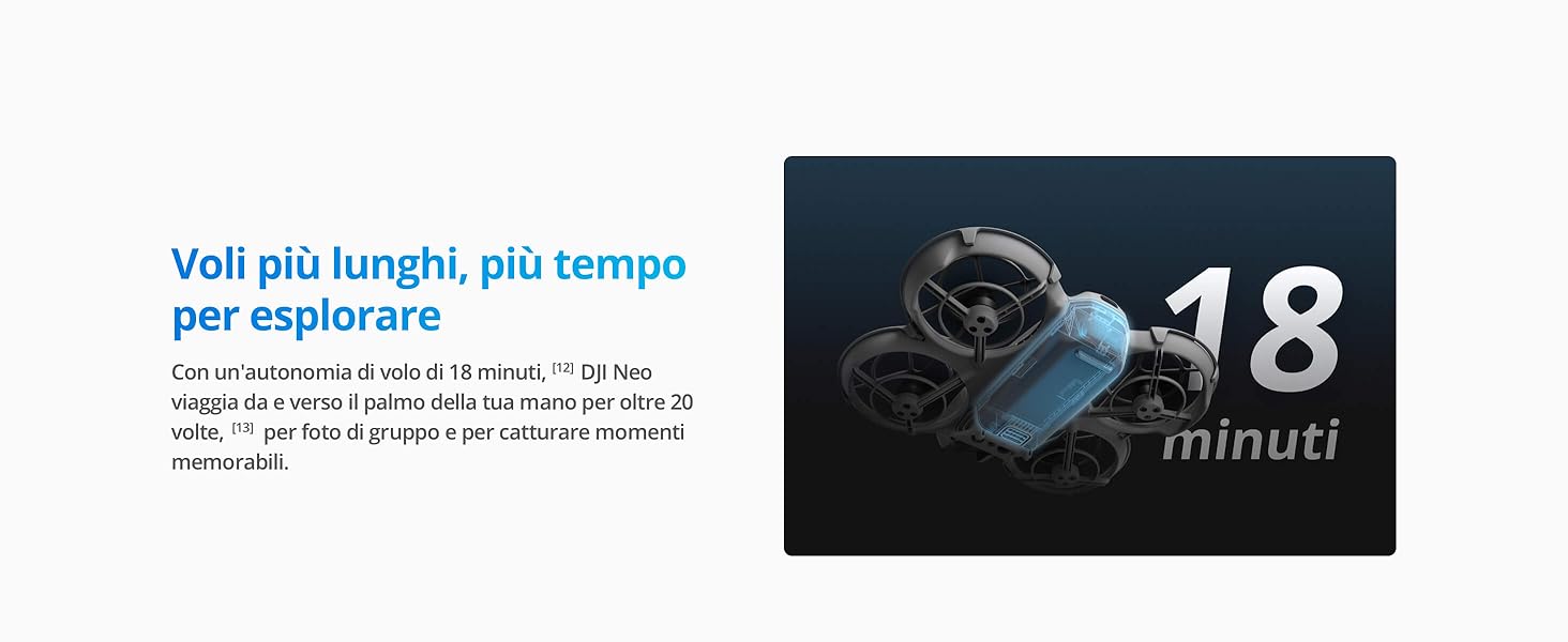 Informazioni su questo articolo Leggero e conforme alle normative - Neo è più leggero di molti smartphone! Mai più esami di certificazione: con soli 135 g di peso, Neo rientra nelle categorie A1 e A3 ed è conforme alla normativa C0. Decollo e atterraggio sul palmo della mano, vai senza radiocomando [1] - Neo decolla dalla tua mano solo premendo un pulsante. Sicuro e facile da usare, Neo è il compagno ideale per i tuoi BBQ in famiglia e le escursioni con gli amici. Tracciamento IA del soggetto e QuickShot - Registra facilmente vlog straordinari mentre DJI Neo ti segue con intelligenza. Filmare immagini professionali non è mai stato così facile, grazie alle otto modalità creative QuickShot! Diverse modalità di controllo, divertimento versatile - Fai volare Neo senza radiocomando, con i comandi vocali (inglese/cinese), usando l'app mobile oppure il radiocomando. Tante opzioni per far volare chiunque! Video ultra stabilizzati in 4K [8] - Nelle escursioni, in kayak, la tecnologia di stabilizzazione DJI, insieme alla resistenza al vento di livello e all'UHD 4K, ti garantiranno filmati fluidi e di alta qualità. Paraeliche integrale - Hai paura di volare? Ora non più! Sfreccia su e giù in casa e tra i rami degli alberi senza timori.* La versione standard di DJI Neo è dotata di batteria, paraeliche e tanto altro, pronta per volare senza radiocomando o con lo smartphone. › Visualizza altri dettagli prodotto Informazioni su questo articolo Leggero e conforme alle normative - Neo è più leggero di molti smartphone! Mai più esami di certificazione: con soli 135 g di peso, Neo rientra nelle categorie A1 e A3 ed è conforme alla normativa C0. Decollo e atterraggio sul palmo della mano, vai senza radiocomando [1] - Neo decolla dalla tua mano solo premendo un pulsante. Sicuro e facile da usare, Neo è il compagno ideale per i tuoi BBQ in famiglia e le escursioni con gli amici. Tracciamento IA del soggetto e QuickShot - Registra facilmente vlog straordinari mentre DJI Neo ti segue con intelligenza. Filmare immagini professionali non è mai stato così facile, grazie alle otto modalità creative QuickShot! Diverse modalità di controllo, divertimento versatile - Fai volare Neo senza radiocomando, con i comandi vocali (inglese/cinese), usando l'app mobile oppure il radiocomando. Tante opzioni per far volare chiunque! Video ultra stabilizzati in 4K [8] - Nelle escursioni, in kayak, la tecnologia di stabilizzazione DJI, insieme alla resistenza al vento di livello e all'UHD 4K, ti garantiranno filmati fluidi e di alta qualità. Paraeliche integrale - Hai paura di volare? Ora non più! Sfreccia su e giù in casa e tra i rami degli alberi senza timori.* La versione standard di DJI Neo è dotata di batteria, paraeliche e tanto altro, pronta per volare senza radiocomando o con lo smartphone. › Visualizza altri dettagli prodotto Product details