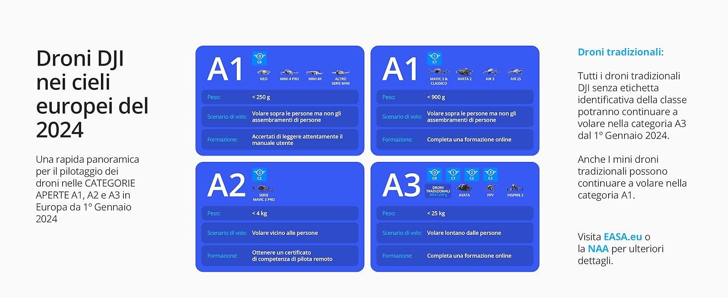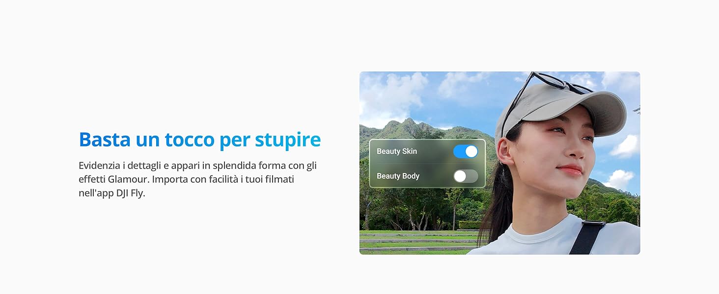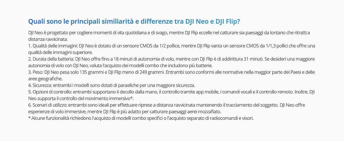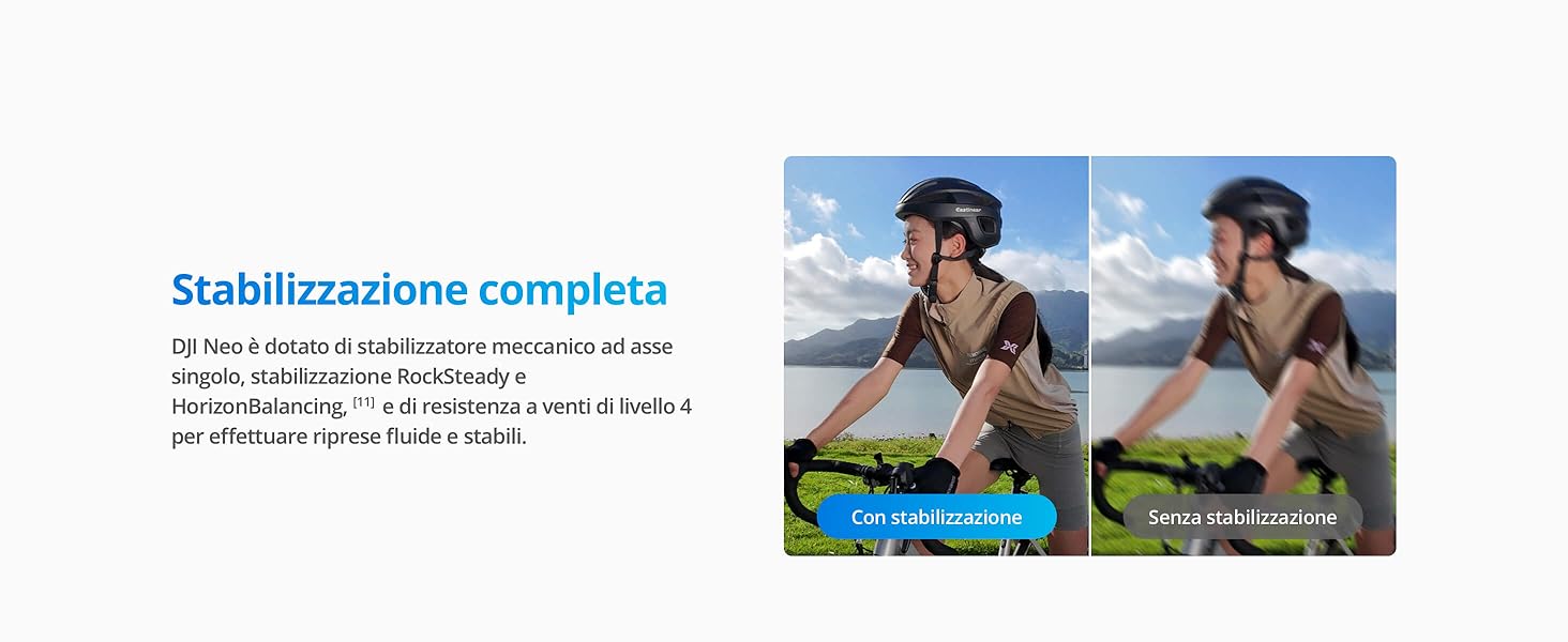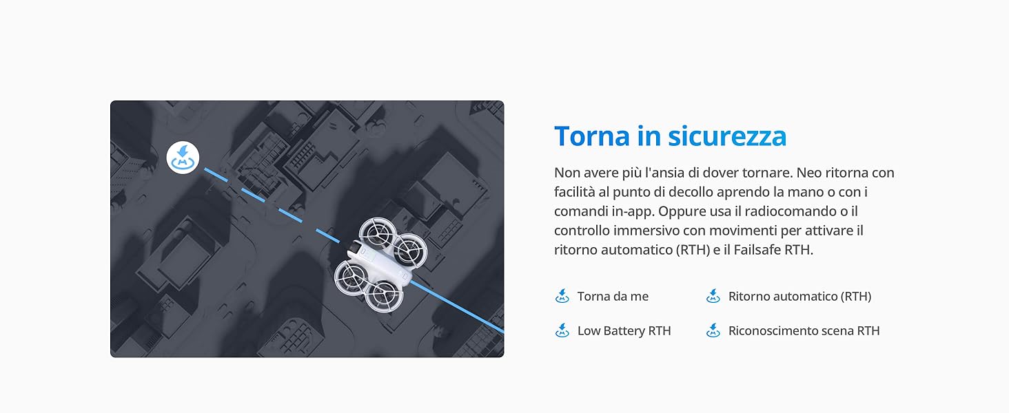 Informazioni su questo articolo Leggero e conforme alle normative - Neo è più leggero di molti smartphone! Mai più esami di certificazione: con soli 135 g di peso, Neo rientra nelle categorie A1 e A3 ed è conforme alla normativa C0. Decollo e atterraggio sul palmo della mano, vai senza radiocomando [1] - Neo decolla dalla tua mano solo premendo un pulsante. Sicuro e facile da usare, Neo è il compagno ideale per i tuoi BBQ in famiglia e le escursioni con gli amici. Tracciamento IA del soggetto e QuickShot - Registra facilmente vlog straordinari mentre DJI Neo ti segue con intelligenza. Filmare immagini professionali non è mai stato così facile, grazie alle otto modalità creative QuickShot! Diverse modalità di controllo, divertimento versatile - Fai volare Neo senza radiocomando, con i comandi vocali (inglese/cinese), usando l'app mobile oppure il radiocomando. Tante opzioni per far volare chiunque! Video ultra stabilizzati in 4K [8] - Nelle escursioni, in kayak, la tecnologia di stabilizzazione DJI, insieme alla resistenza al vento di livello e all'UHD 4K, ti garantiranno filmati fluidi e di alta qualità. Paraeliche integrale - Hai paura di volare? Ora non più! Sfreccia su e giù in casa e tra i rami degli alberi senza timori.* La versione standard di DJI Neo è dotata di batteria, paraeliche e tanto altro, pronta per volare senza radiocomando o con lo smartphone. › Visualizza altri dettagli prodotto Informazioni su questo articolo Leggero e conforme alle normative - Neo è più leggero di molti smartphone! Mai più esami di certificazione: con soli 135 g di peso, Neo rientra nelle categorie A1 e A3 ed è conforme alla normativa C0. Decollo e atterraggio sul palmo della mano, vai senza radiocomando [1] - Neo decolla dalla tua mano solo premendo un pulsante. Sicuro e facile da usare, Neo è il compagno ideale per i tuoi BBQ in famiglia e le escursioni con gli amici. Tracciamento IA del soggetto e QuickShot - Registra facilmente vlog straordinari mentre DJI Neo ti segue con intelligenza. Filmare immagini professionali non è mai stato così facile, grazie alle otto modalità creative QuickShot! Diverse modalità di controllo, divertimento versatile - Fai volare Neo senza radiocomando, con i comandi vocali (inglese/cinese), usando l'app mobile oppure il radiocomando. Tante opzioni per far volare chiunque! Video ultra stabilizzati in 4K [8] - Nelle escursioni, in kayak, la tecnologia di stabilizzazione DJI, insieme alla resistenza al vento di livello e all'UHD 4K, ti garantiranno filmati fluidi e di alta qualità. Paraeliche integrale - Hai paura di volare? Ora non più! Sfreccia su e giù in casa e tra i rami degli alberi senza timori.* La versione standard di DJI Neo è dotata di batteria, paraeliche e tanto altro, pronta per volare senza radiocomando o con lo smartphone. › Visualizza altri dettagli prodotto Product details