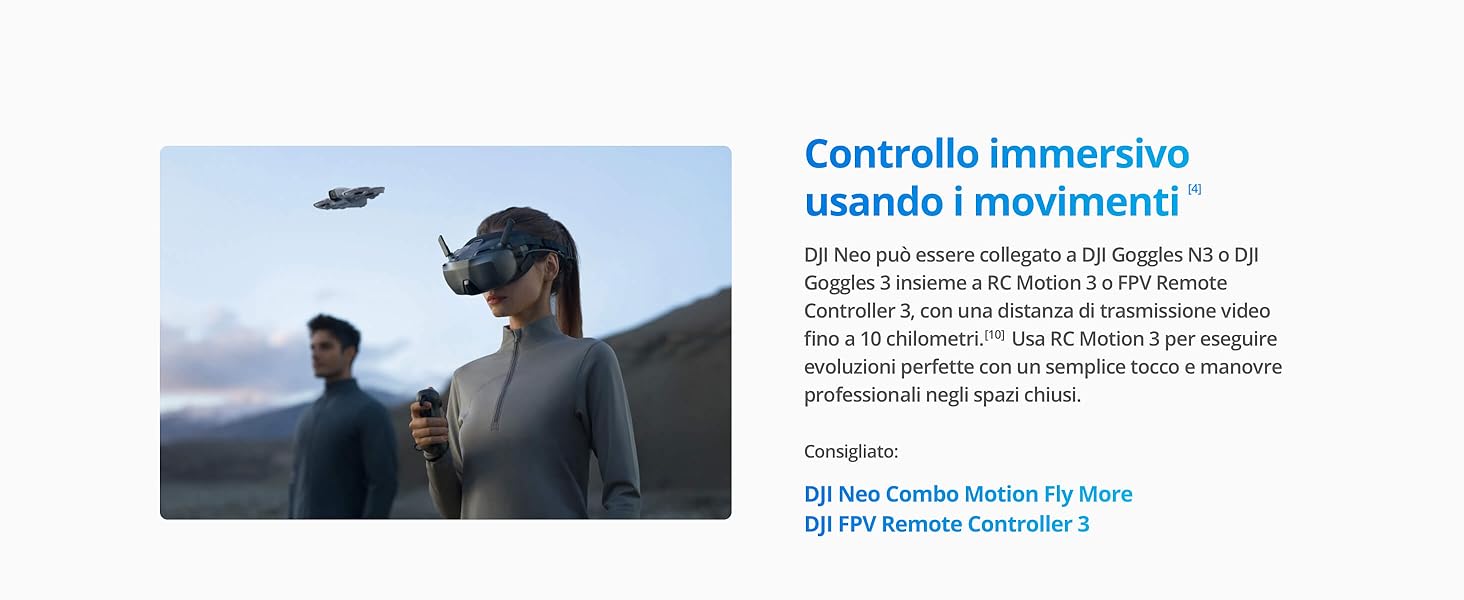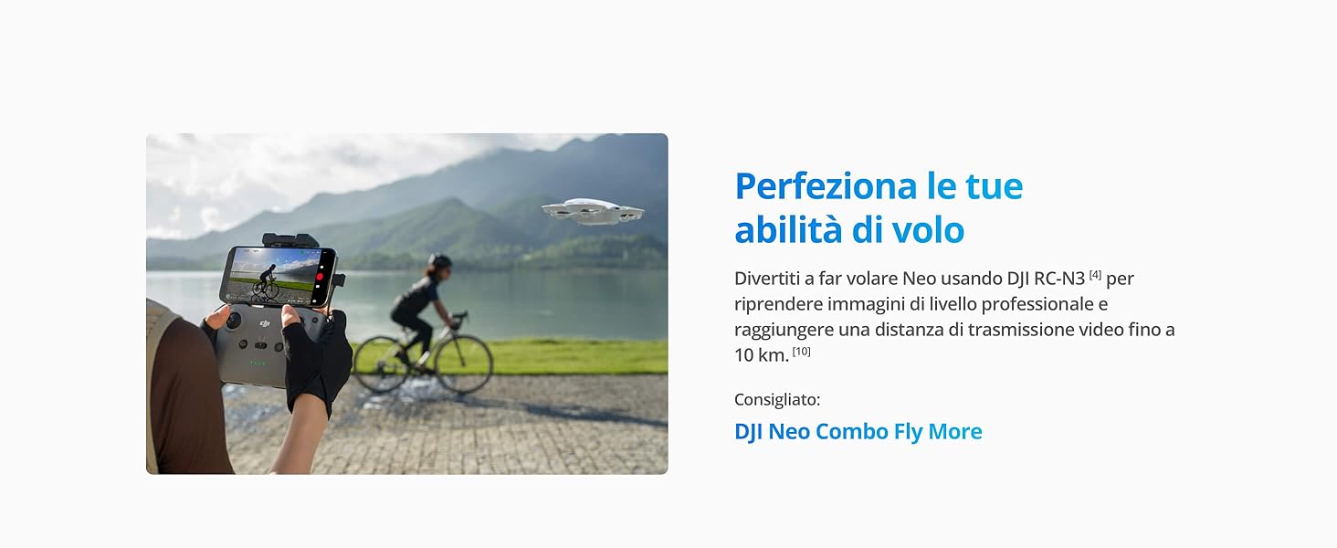 Sorvola paesaggi mozzafiato ed esplora luoghi straordinari, al chiuso o all'aperto, includendo davvero tutti nelle foto di gruppo. Scopri la vita di ogni giorno da una nuova prospettiva, con DJI Neo. DJI Neo è disponibile in 4 opzioni di acquisto: DJI Neo Combo Standard include DJI Neo, una batteria, paraeliche (coppia) e altro. DJI Neo Combo Doppia batteria offre più versatilità alla tua autonomia di volo. Include DJI Neo, due batterie, paraeliche (coppia) e altro. DJI Neo Combo Fly More è dedicato a chi ama l'avventura e non vuole perdersi nulla, con DJI Neo, RC-N3, tre batterie, hub di ricarica a due vie, paraeliche (coppia) e altro. DJI Neo Combo Motion Fly More offre un'esperienza di controllo con movimenti immersiva. Include DJI Neo, RC Motion 3, Goggles N3, tre batterie, hub di ricarica e altro.