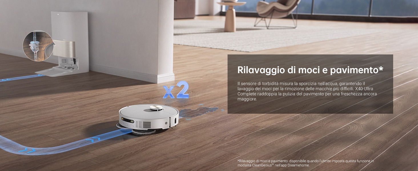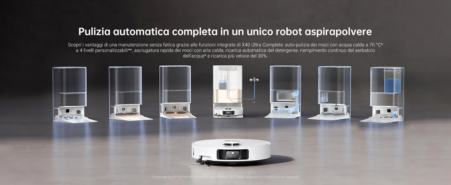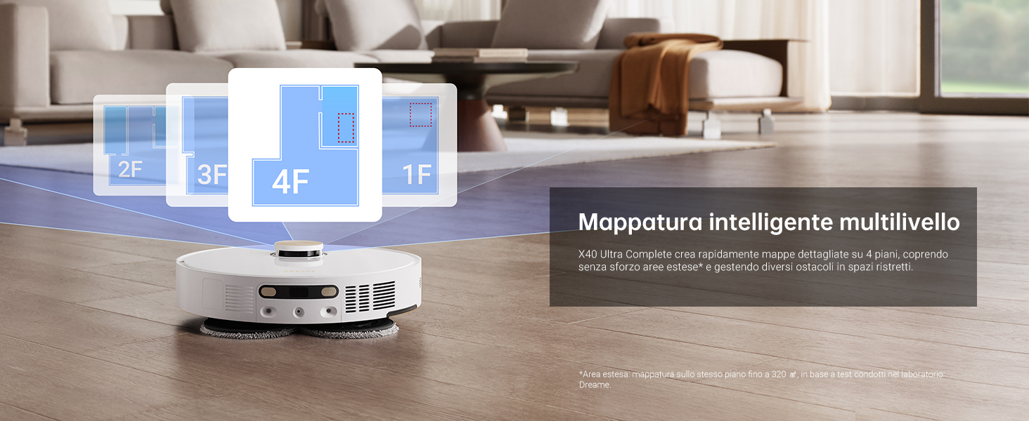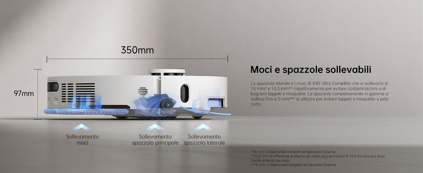Marchio dreame Nome modello X40 Ultra Complete Caratteristica speciale Anti-Collision, Automatic Dust Collection, Auto Mop Washing, Anti-Fall, Advanced Custom Cleaning Colore Bianco Dimensioni del prodotto 35L x 35l x 9,7H cm Product details