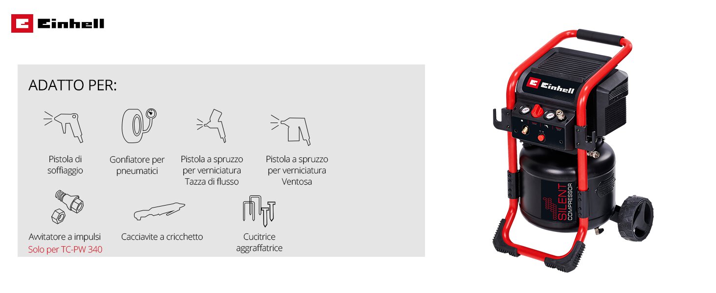 Einhell Compressore TE AC 240/24 Silent (1500 W, max. 10 bar, serbatoio da 24 l, potenza di aspirazione 240 l/min, compressore silenziato da 70 dB, 2 manometri, riduttore di pressione) : Amazon.it: Fai da te