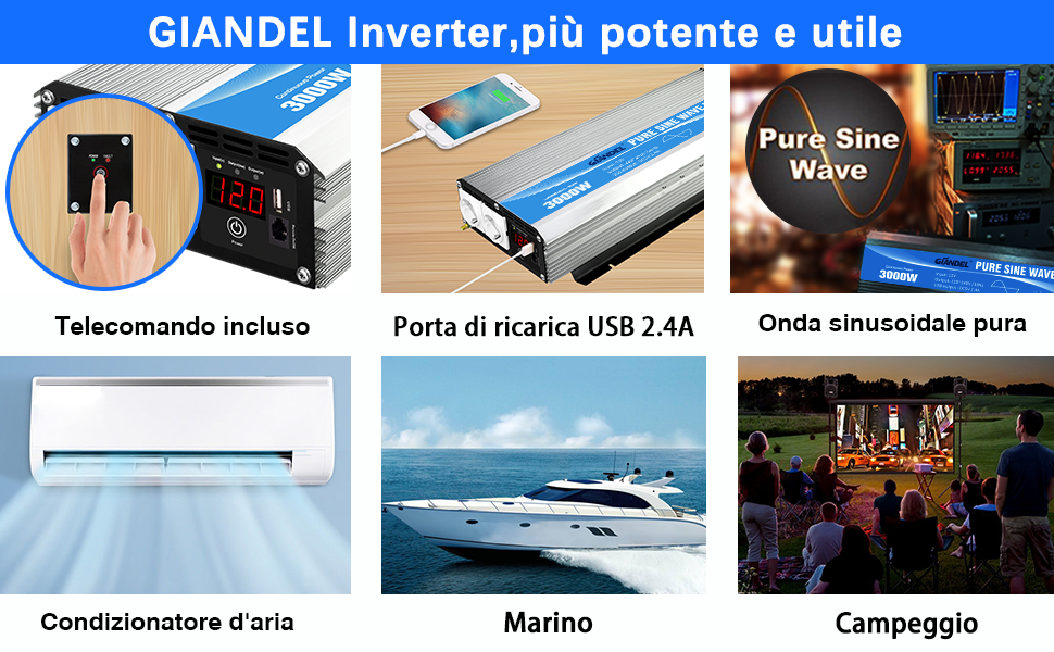 Informazioni su questo articolo GIANDEL 3000Watts inverter a onda sinusoidale pura fornisce 3000W di potenza continua, 6000W di picco di potenza, doppie prese AC e porta USB 1x2.4A Con un telecomando: lunghezza del cavo 15 piedi, comodo da controllare ON / OFF. Le prese AC da 220V 230V 240V Forniscono una potenza continua da continua a AC da 3000 watt che può essere utilizzata per emergenza, campeggio e per auto, casa, camper, solare. Tecnologia Soft Start e progettazione ingresso / uscita isolata e protezioni complete di sicurezza: protezione da sovratensione, sovraccarico, sovratensione, sottotensione, surriscaldamento, cortocircuito Il robusto e resistente alloggiamento in lega di alluminio offre una protezione avanzata da cadute e urti. La ventola di raffreddamento integrata aiuta a ridurre il calore e previene le carenze. Il prodotto ha un'assicurazione AIG: L'assicurazione sulla responsabilità civile del prodotto è coperta dalla compagnia assicurativa AIG. 12 mesi di garanzia › Visualizza altri dettagli prodotto Informazioni su questo articolo GIANDEL 3000Watts inverter a onda sinusoidale pura fornisce 3000W di potenza continua, 6000W di picco di potenza, doppie prese AC e porta USB 1x2.4A Con un telecomando: lunghezza del cavo 15 piedi, comodo da controllare ON / OFF. Le prese AC da 220V 230V 240V Forniscono una potenza continua da continua a AC da 3000 watt che può essere utilizzata per emergenza, campeggio e per auto, casa, camper, solare. Tecnologia Soft Start e progettazione ingresso / uscita isolata e protezioni complete di sicurezza: protezione da sovratensione, sovraccarico, sovratensione, sottotensione, surriscaldamento, cortocircuito Il robusto e resistente alloggiamento in lega di alluminio offre una protezione avanzata da cadute e urti. La ventola di raffreddamento integrata aiuta a ridurre il calore e previene le carenze. Il prodotto ha un'assicurazione AIG: L'assicurazione sulla responsabilità civile del prodotto è coperta dalla compagnia assicurativa AIG. 12 mesi di garanzia › Visualizza altri dettagli prodotto Product details