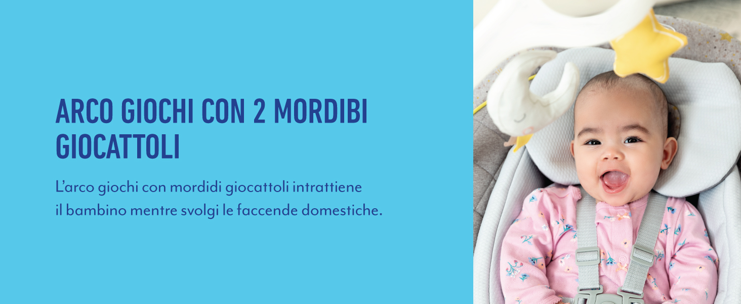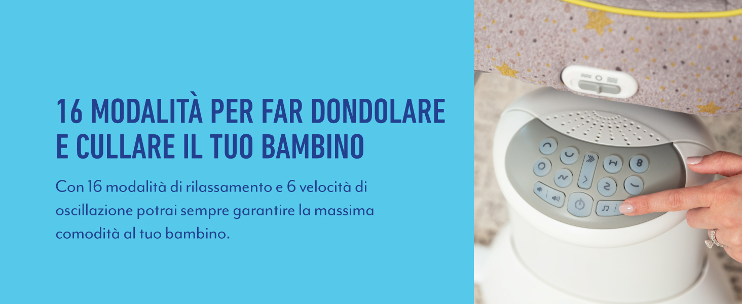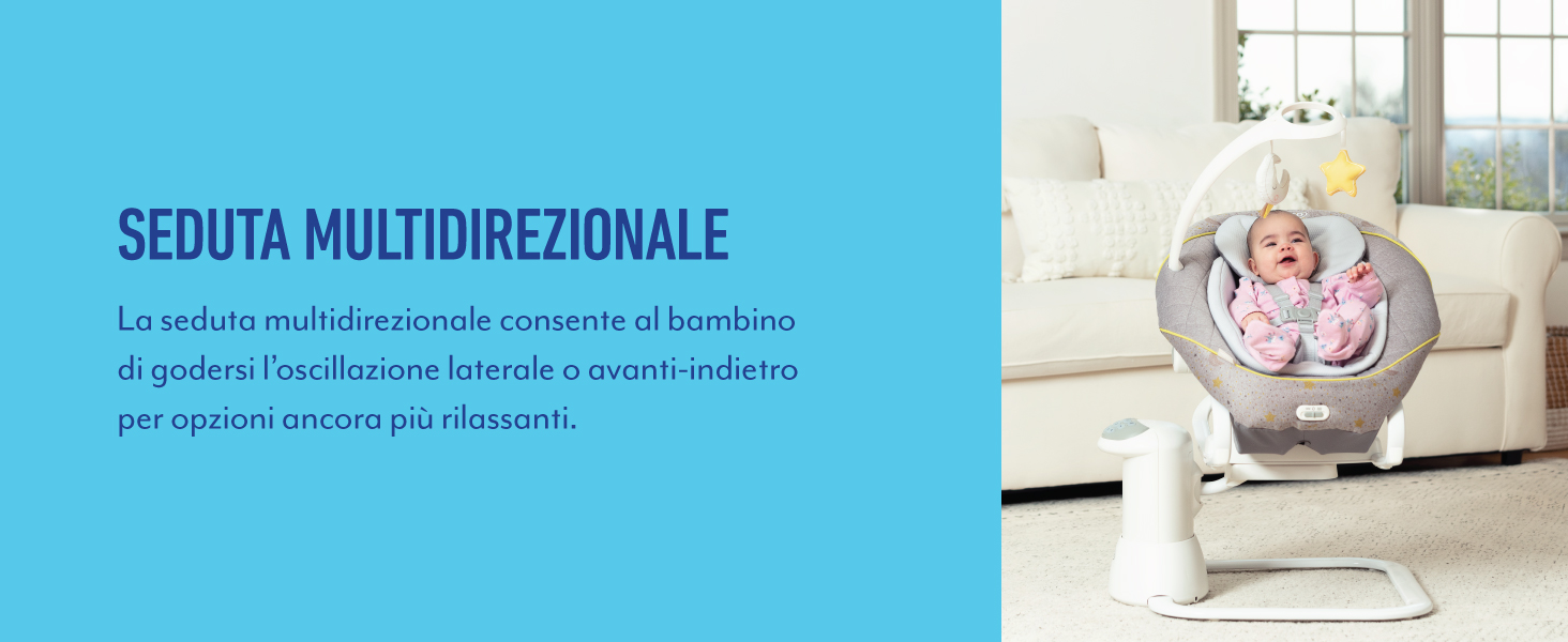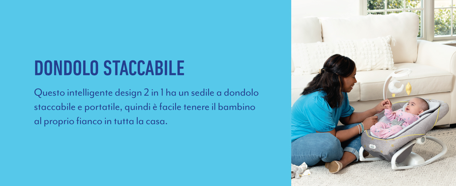 L’innovativa sdraietta All Ways, con dondolo rimovibile, si presenta come una sdraietta multiuso con 16 diversi movimenti rilassanti per vedere sempre il bambino sorridere. Otto modalità di oscillazione significano più opzioni rilassanti per confortare il bambino: arco, oscillazione avanti indietro, rimbalzo, figura “a forma di 8”, cerchio, onda, zig zag e oscillazione laterale. Due diverse direzioni di oscillazione (laterale o avanti e indietro) per bambini sempre sorridenti. La seduta della sdraietta diventa dondolo removibile per tenere il bambino vicino a sé quando si è in casa. La possibilità di connetterla alla spina offre maggiore comodità di utilizzo, mentre la cintura ritentiva a 5 punti tiene il bambino al sicuro.