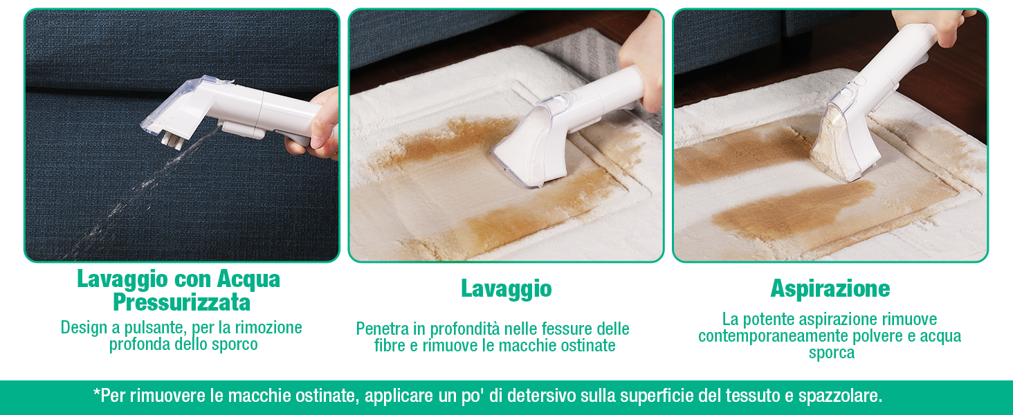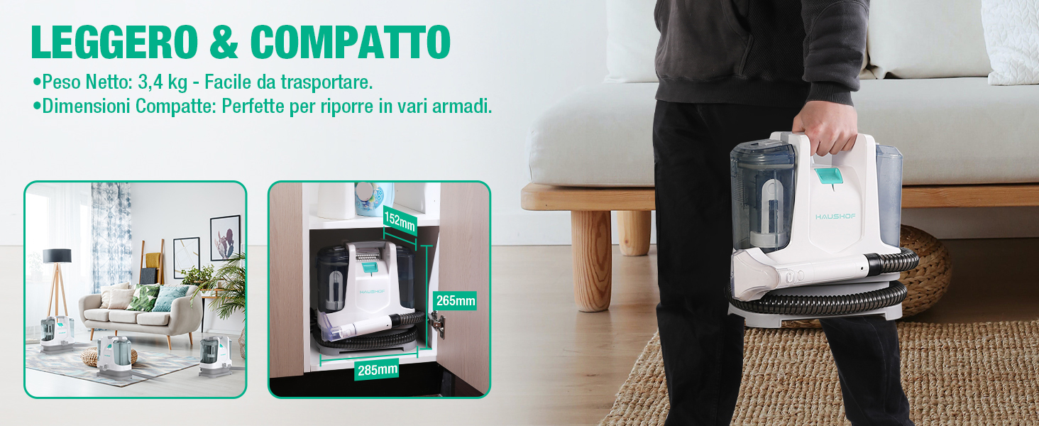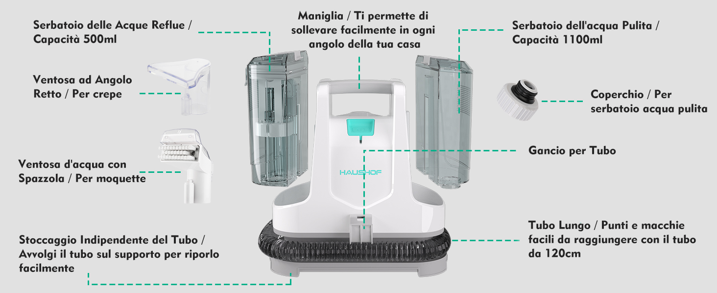 Informazioni su questo articolo 【Potente Pulizia】Ha un potente motore da 400W con 9.000 Pa di potenza di aspirazione.Ideale per la pulizia efficace di divani in tessuto, tappeti e interni di automobili. 1 bocche di aspirazione con spazzola per tappeti, moquette, tappezzeria e scale, ecc. 1 bocche di aspirazione ad angolo retto per fessure come gli angoli dei divani e dei letti. I due aspiratori funzionano perfettamente insieme per macchie in ogni angolo 【Doppio Serbatoio】Serbatoi d'acqua rimovibili per un facile riempimento e svuotamento. Il sistema a due serbatoi consente di pulire con acqua pulita mentre lo sporco e la polvere vengono raccolti in un serbatoio separato. Capacità del serbatoio d'acqua pulita: 1100ml, capacità del serbatoio delle acque reflue: 500ml 【Arresto intelligente】Quando l'acqua di scarico raggiunge i 500 ml (sopra la linea di punta del serbatoio), Lavatappeti interrompe automaticamente l'aspirazione (il motore è ancora in funzione) per evitare che l'acqua e la schiuma trabocchino. Spegnere la macchina per svuotare il serbatoio dell'acqua di scarico e riprendere il lavoro. 【NOTA BENE】 Se la macchina non spruzza acqua dopo l'avvio, allentare leggermente il coperchio sul fondo del serbatoio dell'acqua pulita (assicurarsi che non goccioli) e verificare che il serbatoio sia installato correttamente (premere il serbatoio per far scattare la parte superiore in posizione, Nessuno spazio tra il serbatoio e il corpo macchina). 【Guida all'uso】Si consiglia di utilizzare acqua elettrolitica debolmente acida o un detergente con poca schiuma. Svuotare tempestivamente il serbatoio dopo che la macchina ha smesso di aspirare acqua. Si raccomanda di non spruzzare troppa acqua alla volta, ma di bagnare solo la superficie dell'oggetto. 【Facile da Trasportare】Il pulitore pesa 3,4kg e ha una comoda maniglia nella parte superiore che consente di raggiungere facilmente tutti gli angoli della tua casa. Se hai domande sull'utilizzo, non esitare a contattarci. Viene fornito con un tubo integrato di 120cm per rimuovere le macchie. Dispone di uno spazio di archiviazione indipendente per il tubo: avvolgere il tubo sul supporto per riporlo facilmente › Visualizza altri dettagli prodotto Informazioni su questo articolo 【Potente Pulizia】Ha un potente motore da 400W con 9.000 Pa di potenza di aspirazione.Ideale per la pulizia efficace di divani in tessuto, tappeti e interni di automobili. 1 bocche di aspirazione con spazzola per tappeti, moquette, tappezzeria e scale, ecc. 1 bocche di aspirazione ad angolo retto per fessure come gli angoli dei divani e dei letti. I due aspiratori funzionano perfettamente insieme per macchie in ogni angolo 【Doppio Serbatoio】Serbatoi d'acqua rimovibili per un facile riempimento e svuotamento. Il sistema a due serbatoi consente di pulire con acqua pulita mentre lo sporco e la polvere vengono raccolti in un serbatoio separato. Capacità del serbatoio d'acqua pulita: 1100ml, capacità del serbatoio delle acque reflue: 500ml 【Arresto intelligente】Quando l'acqua di scarico raggiunge i 500 ml (sopra la linea di punta del serbatoio), Lavatappeti interrompe automaticamente l'aspirazione (il motore è ancora in funzione) per evitare che l'acqua e la schiuma trabocchino. Spegnere la macchina per svuotare il serbatoio dell'acqua di scarico e riprendere il lavoro. 【NOTA BENE】 Se la macchina non spruzza acqua dopo l'avvio, allentare leggermente il coperchio sul fondo del serbatoio dell'acqua pulita (assicurarsi che non goccioli) e verificare che il serbatoio sia installato correttamente (premere il serbatoio per far scattare la parte superiore in posizione, Nessuno spazio tra il serbatoio e il corpo macchina). 【Guida all'uso】Si consiglia di utilizzare acqua elettrolitica debolmente acida o un detergente con poca schiuma. Svuotare tempestivamente il serbatoio dopo che la macchina ha smesso di aspirare acqua. Si raccomanda di non spruzzare troppa acqua alla volta, ma di bagnare solo la superficie dell'oggetto. 【Facile da Trasportare】Il pulitore pesa 3,4kg e ha una comoda maniglia nella parte superiore che consente di raggiungere facilmente tutti gli angoli della tua casa. Se hai domande sull'utilizzo, non esitare a contattarci. Viene fornito con un tubo integrato di 120cm per rimuovere le macchie. Dispone di uno spazio di archiviazione indipendente per il tubo: avvolgere il tubo sul supporto per riporlo facilmente › Visualizza altri dettagli prodotto Product details