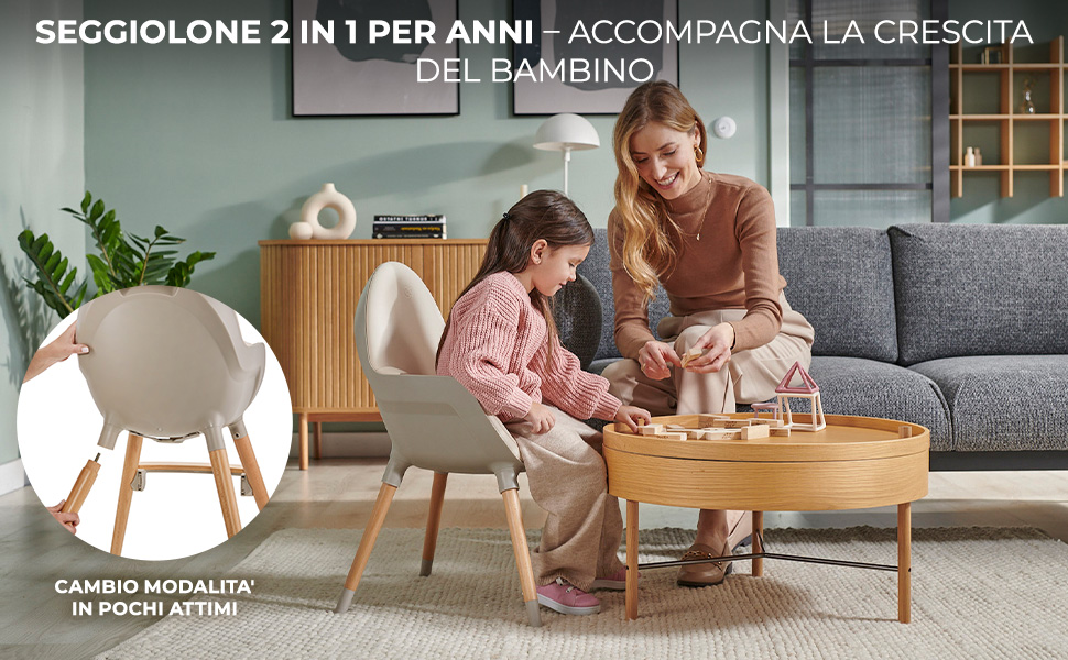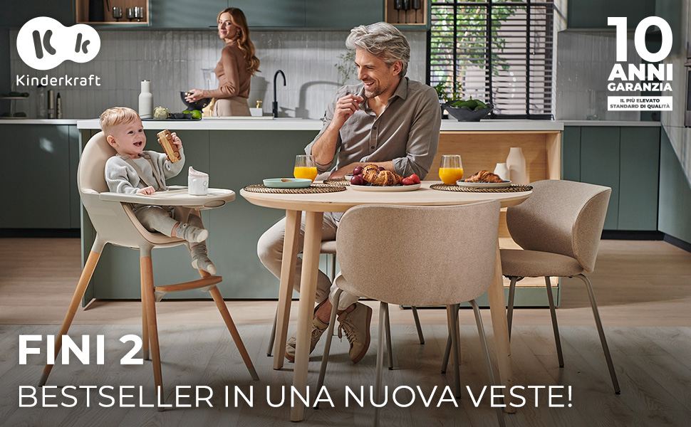 FINI 2 è un seggiolone multifunzioni. All’inizio servirà da seggiolone da pappa fino al raggiungimento di 15 kg e più tardi da sedia per giocare o riposare fino all’età di 5 anni circa. È un successore dell’iconico seggiolone FINI da Kinderkraft – in una nuova versione migliorata, Il seggiolone dispone di un doppio vassoio regolabile. Puoi impostarlo in una delle 3 distanze dalla seduta assicurando in questo modo uno spazio sufficiente al bambino per godersi il pasto. Il vassoio superiore è facile da rimuovere e lavare – può essere pulito sotto l’acqua corrente. Serve anche da protezione supplementare del bambino. FINI 2 è un seggiolone comodo e adatto alle esigenze dei piccoli e grandi – è dotato di una seduta ampia e profonda. Lo schienale è alto e sagomato e il tutto è rifinito con ecopelle liscia e piacevole al tatto. Anche il poggiapiedi aumenta il comfort dei pasti, assicura un adeguato supporto ai piedi ed è regolabile. Grazie alla sua struttura sostiene una corretta postura durante i pasti. FINI 2 è un seggiolone sicuro: le gambe sono rifinite con punte antiscivolo che garantiscono stabilità e sicurezza. Il seggiolone è dotato di regolabili cinture di sicurezza a 5 punti e di una protezione inguinale. Grazie a questo il tuo piccoletto potrà intraprendere l’avventura di mangiare da solo in piena sicurezza. FINI 2 significa anche il comfort dei genitori: sul retro dello schienale si trova un maniglione per il trasporto del seggiolone. Il piccolino vuole mangiare in cucina? Oppure ha cambiato idea e preferisce mangiare in sala da pranzo? Ci metterai pochi attimi per spostare FINI 2! Il seggiolone da pappa FINI 2 è realizzato in materiali di alta qualità: le gambe del seggiolone e il poggiapiedi sono in elegante e intramontabile legno di faggio. È resistente e incredibilmente stiloso – questo seggiolone diventerà presto un vero e proprio abbellimento della vostra casa. L’ecopelle utilizzata per la seduta è liscia, resistente e facile da pulire. Basta passare un panno umido. Realizzazione Materiali: vassoio: plastica PP; rivestimento della seduta: ecopelle; gambe e poggiapiedi: legno di faggio