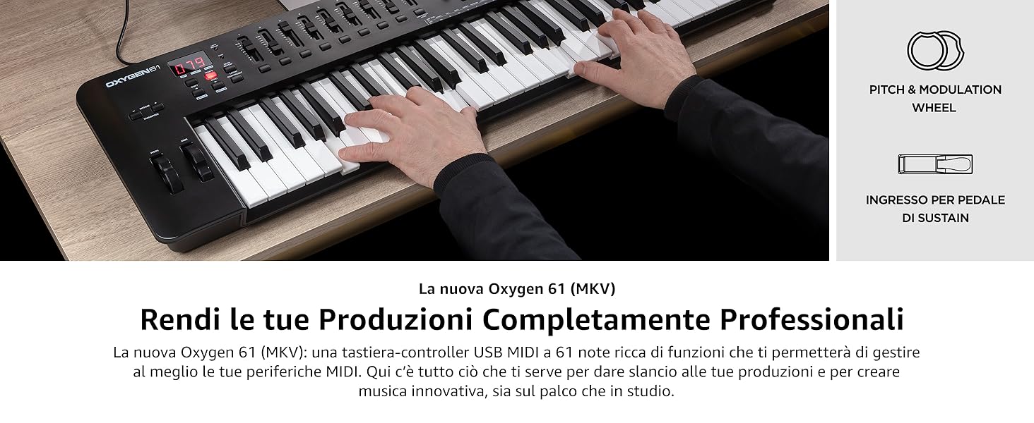 Marchio M-Audio Numero di tasti 61 Tecnologia di connettività USB Caratteristica speciale (function(f) {var _np=(window.P._namespace("DetailPageProductOverviewTemplatesJava"));if(_np.guardFatal){_np.guardFatal(f)(_np);}else{f(_np);}}(function(P) { P.when('A').execute(function(A){ A.on('a:truncate:po-attribute-truncate-3:updated', function(data) { var isTruncated = !data.truncateInstance.getIfTextFits(); var seeMoreElement = document.getElementById('po-attribute-see-more-id-3'); if(seeMoreElement) { seeMoreElement.style.display = isTruncated ? '' : 'none'; } }) });})); velocity sensitive keys; USB powered; sustain input; pitch and mod wheels; production software included Mostra altro Nome modello Oxygen 61 MKV Product details