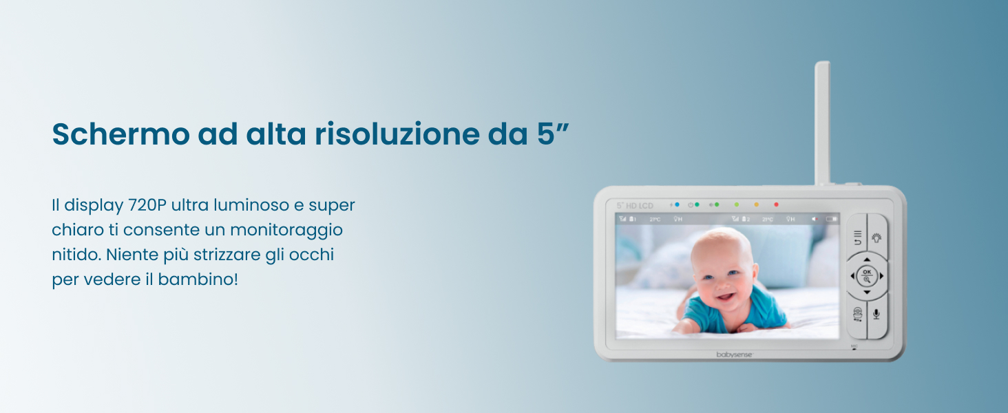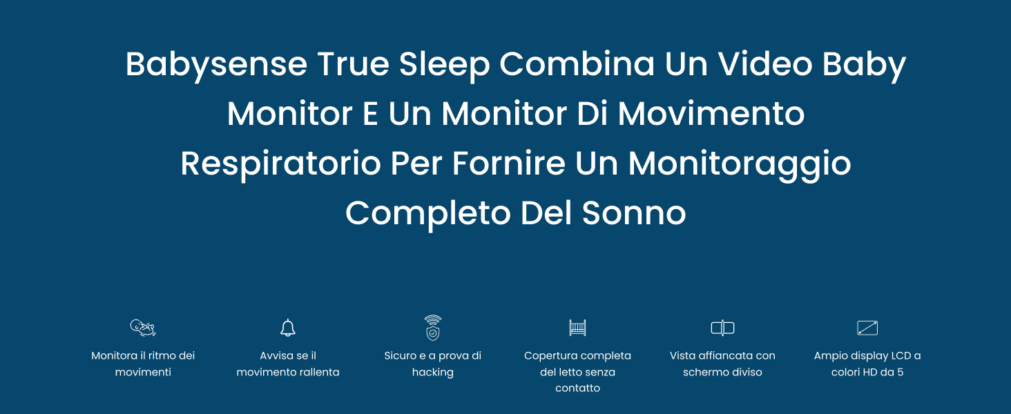 Informazioni su questo articolo Pacchetto Valore Vero Sonno: Combina il monitor del movimento del bambino senza contatto Babysense 7 con avvisi in tempo reale per assenza di movimento respiratorio e il monitor video per bambini HD da 5" con telecamera a luce notturna e suoni di rumore bianco. Babysense garantisce che tu venga immediatamente avvisato di qualsiasi cambiamento nell'ambiente di sonno del tuo bambino Monitora e Avvisa per Irregolarità nel Movimento Respiratorio: il monitor del movimento sotto il materasso attiva un allarme se non viene rilevato alcun movimento respiratorio entro 20 secondi o se il movimento rallenta a meno di 10 micro-movimenti al minuto, garantendo la massima sicurezza per il tuo bambino Monitor Sicuro e Senza Rischio di Hacking con Pannelli Sensoriali Senza Contatto: il Monitor Video non si connette a WiFi o Internet e presenta una tecnologia avanzata FHSS a 2,4 GHz per una connessione sicura e protetta da hacking. È fornito con un monitor respiratorio avanzato senza contatto, dotato di due pannelli sensoriali per coprire l'intera area della culla senza toccare il bambino o disturbare il suo sonno Rassicura e conforta il tuo bambino: Con una luce notturna regolabile, audio bidirezionale e ninna nanna calmanti o suoni di rumore bianco per tranquillizzare il tuo bambino da remoto; suoni rilassanti creano un ambiente pacifico, aiutando il tuo bambino a rilassarsi e dormire profondamente Tieni d'occhio il tuo bambino nella nursery 24 ore su 24, 7 giorni su 7, grazie alla visione notturna a infrarossi di questo baby monitor portatile di fascia alta. A differenza della maggior parte dei baby monitor standard, questo baby monitor video HD è dotato di una telecamera azionata a distanza, con luce notturna regolabile integrata Installazione e utilizzo facili e senza complicazioni: Goditi la tranquillità con questo monitor per bambini non indossabile che non richiede configurazioni complesse o regolazioni quotidiane. Installazione semplice una tantum senza ulteriori necessità di disturbare il tuo bambino con dispositivi indossabili o regolazioni frequenti; perfetto per genitori impegnati che vogliono mantenere tutto senza complicazioni, semplice e sicuro › Visualizza altri dettagli prodotto Informazioni su questo articolo Pacchetto Valore Vero Sonno: Combina il monitor del movimento del bambino senza contatto Babysense 7 con avvisi in tempo reale per assenza di movimento respiratorio e il monitor video per bambini HD da 5" con telecamera a luce notturna e suoni di rumore bianco. Babysense garantisce che tu venga immediatamente avvisato di qualsiasi cambiamento nell'ambiente di sonno del tuo bambino Monitora e Avvisa per Irregolarità nel Movimento Respiratorio: il monitor del movimento sotto il materasso attiva un allarme se non viene rilevato alcun movimento respiratorio entro 20 secondi o se il movimento rallenta a meno di 10 micro-movimenti al minuto, garantendo la massima sicurezza per il tuo bambino Monitor Sicuro e Senza Rischio di Hacking con Pannelli Sensoriali Senza Contatto: il Monitor Video non si connette a WiFi o Internet e presenta una tecnologia avanzata FHSS a 2,4 GHz per una connessione sicura e protetta da hacking. È fornito con un monitor respiratorio avanzato senza contatto, dotato di due pannelli sensoriali per coprire l'intera area della culla senza toccare il bambino o disturbare il suo sonno Rassicura e conforta il tuo bambino: Con una luce notturna regolabile, audio bidirezionale e ninna nanna calmanti o suoni di rumore bianco per tranquillizzare il tuo bambino da remoto; suoni rilassanti creano un ambiente pacifico, aiutando il tuo bambino a rilassarsi e dormire profondamente Tieni d'occhio il tuo bambino nella nursery 24 ore su 24, 7 giorni su 7, grazie alla visione notturna a infrarossi di questo baby monitor portatile di fascia alta. A differenza della maggior parte dei baby monitor standard, questo baby monitor video HD è dotato di una telecamera azionata a distanza, con luce notturna regolabile integrata Installazione e utilizzo facili e senza complicazioni: Goditi la tranquillità con questo monitor per bambini non indossabile che non richiede configurazioni complesse o regolazioni quotidiane. Installazione semplice una tantum senza ulteriori necessità di disturbare il tuo bambino con dispositivi indossabili o regolazioni frequenti; perfetto per genitori impegnati che vogliono mantenere tutto senza complicazioni, semplice e sicuro › Visualizza altri dettagli prodotto Product details