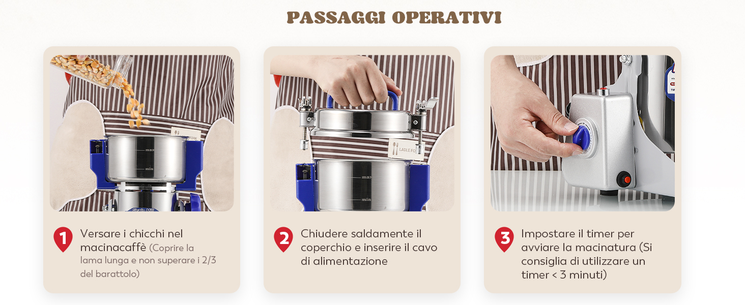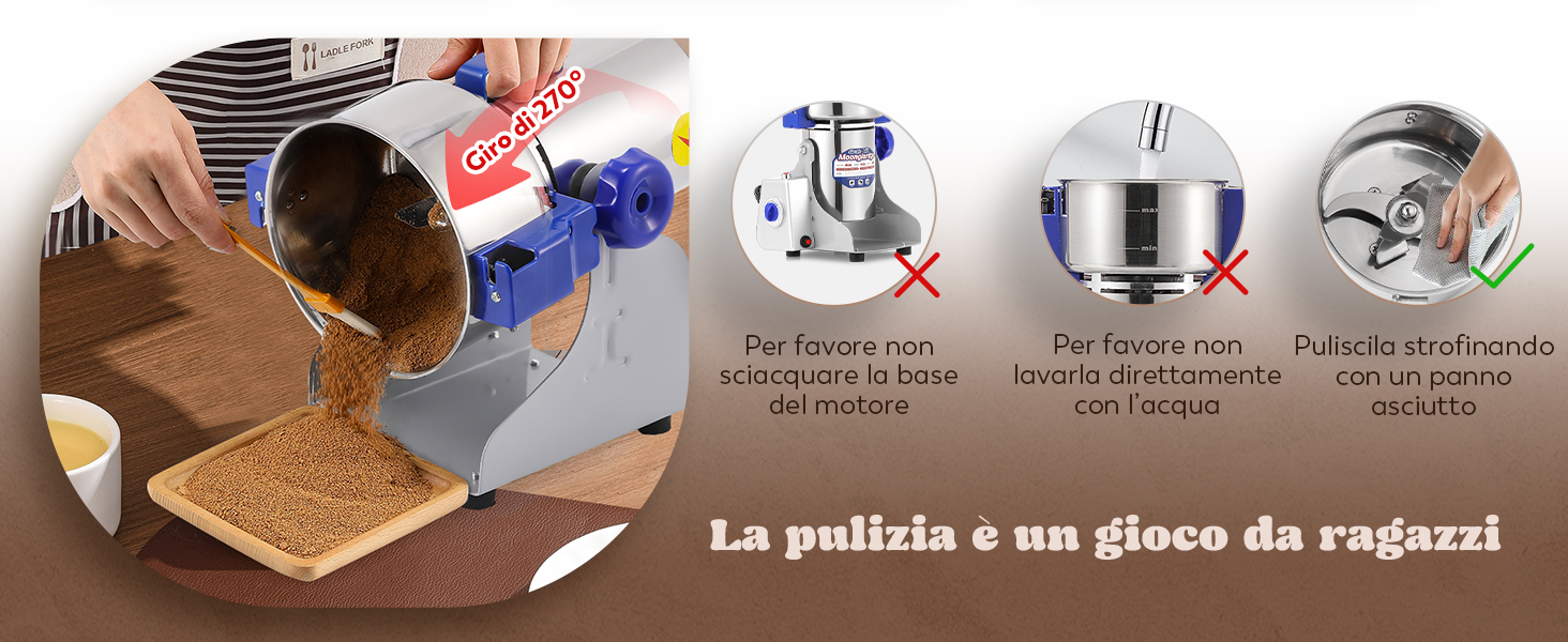 Informazioni su questo articolo 🌾 [UTILIZZO SICURO] Il nostro mulino per cereali di una FIBBIA SICURA su entrambi i lati del coperchio. Quindi, se apri il coperchio durante la molatura, il macinino smetterà di funzionare immediatamente. * Se il mulino per farina non si avvia normalmente, regolare il coperchio in modo che venga spinto all'estremità delle due strutture a fibbia su entrambi i lati senza spazi vuoti. 🌾 [MATERIALE SANO] L'intero corpo del macina spezie è realizzato in acciaio inossidabile di alta qualità e soddisfa i requisiti di sicurezza alimentare. * Il tempo di funzionamento consigliato non più di 3 min. Non utilizzare la macchina continuamente. Dopo ogni 3 minuti di macinatura, dovresti interrompere da 5 a 10 min. Se non sei soddisfatto dell'effetto macinatura, puoi setacciare le particelle grossolane con un setaccio a maglie e macinare di nuovo per ottenere una polvere più fine. 🌾 [MULTIUSO] Questa macchina per polveri super fini è adatta per spruzzare tutti i tipi di materiali secchi, inclusi cereali, spezie ed erbe come riso, soia, chicchi di caffè, mais, grano, sale, pepe, cumino ... * Il materiale da macinare deve essere abbastanza asciutto. Assicurarsi che i materiali da macinare coprano la lama lunga e non più di 2/3 del contenitore, in modo che ci sia spazio per la rotazione della lama durante la molatura. 🌾 [SPECIFICHE] Capacità di macinazione: 800g; Grado di macinazione: 50-300 mesh; Orario di lavoro: 5 minuti; Tempo di intervallo: 5 minuti; Velocità: 36000r/min; Potenza: 2500W. 🌾 [PACKING LIST] Mulino per grano elettrico * 1; Lama di ricambio * 1 set; Spazzola di carbone * 2; Pennello per la pulizia * 1; Setaccio * 1; Manuale dell'utente * 1; Scheda post-vendita * 1. (* Siamo molto spiacenti che ci siano piccoli graffi e vaiolature durante il processo di produzione e lavorazione che non possono essere evitati. Spero che tu possa capire :) [Se hai domande o esigenze, ti preghiamo di contattarci a in qualsiasi momento e ti daremo una risposta rapida e il miglior aiuto.] › Visualizza altri dettagli prodotto Informazioni su questo articolo 🌾 [UTILIZZO SICURO] Il nostro mulino per cereali di una FIBBIA SICURA su entrambi i lati del coperchio. Quindi, se apri il coperchio durante la molatura, il macinino smetterà di funzionare immediatamente. * Se il mulino per farina non si avvia normalmente, regolare il coperchio in modo che venga spinto all'estremità delle due strutture a fibbia su entrambi i lati senza spazi vuoti. 🌾 [MATERIALE SANO] L'intero corpo del macina spezie è realizzato in acciaio inossidabile di alta qualità e soddisfa i requisiti di sicurezza alimentare. * Il tempo di funzionamento consigliato non più di 3 min. Non utilizzare la macchina continuamente. Dopo ogni 3 minuti di macinatura, dovresti interrompere da 5 a 10 min. Se non sei soddisfatto dell'effetto macinatura, puoi setacciare le particelle grossolane con un setaccio a maglie e macinare di nuovo per ottenere una polvere più fine. 🌾 [MULTIUSO] Questa macchina per polveri super fini è adatta per spruzzare tutti i tipi di materiali secchi, inclusi cereali, spezie ed erbe come riso, soia, chicchi di caffè, mais, grano, sale, pepe, cumino ... * Il materiale da macinare deve essere abbastanza asciutto. Assicurarsi che i materiali da macinare coprano la lama lunga e non più di 2/3 del contenitore, in modo che ci sia spazio per la rotazione della lama durante la molatura. 🌾 [SPECIFICHE] Capacità di macinazione: 800g; Grado di macinazione: 50-300 mesh; Orario di lavoro: 5 minuti; Tempo di intervallo: 5 minuti; Velocità: 36000r/min; Potenza: 2500W. 🌾 [PACKING LIST] Mulino per grano elettrico * 1; Lama di ricambio * 1 set; Spazzola di carbone * 2; Pennello per la pulizia * 1; Setaccio * 1; Manuale dell'utente * 1; Scheda post-vendita * 1. (* Siamo molto spiacenti che ci siano piccoli graffi e vaiolature durante il processo di produzione e lavorazione che non possono essere evitati. Spero che tu possa capire :) [Se hai domande o esigenze, ti preghiamo di contattarci a in qualsiasi momento e ti daremo una risposta rapida e il miglior aiuto.] › Visualizza altri dettagli prodotto Product details