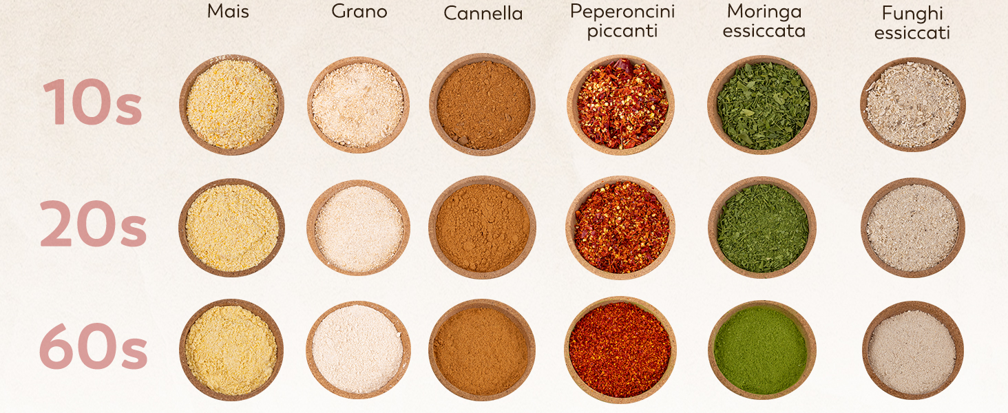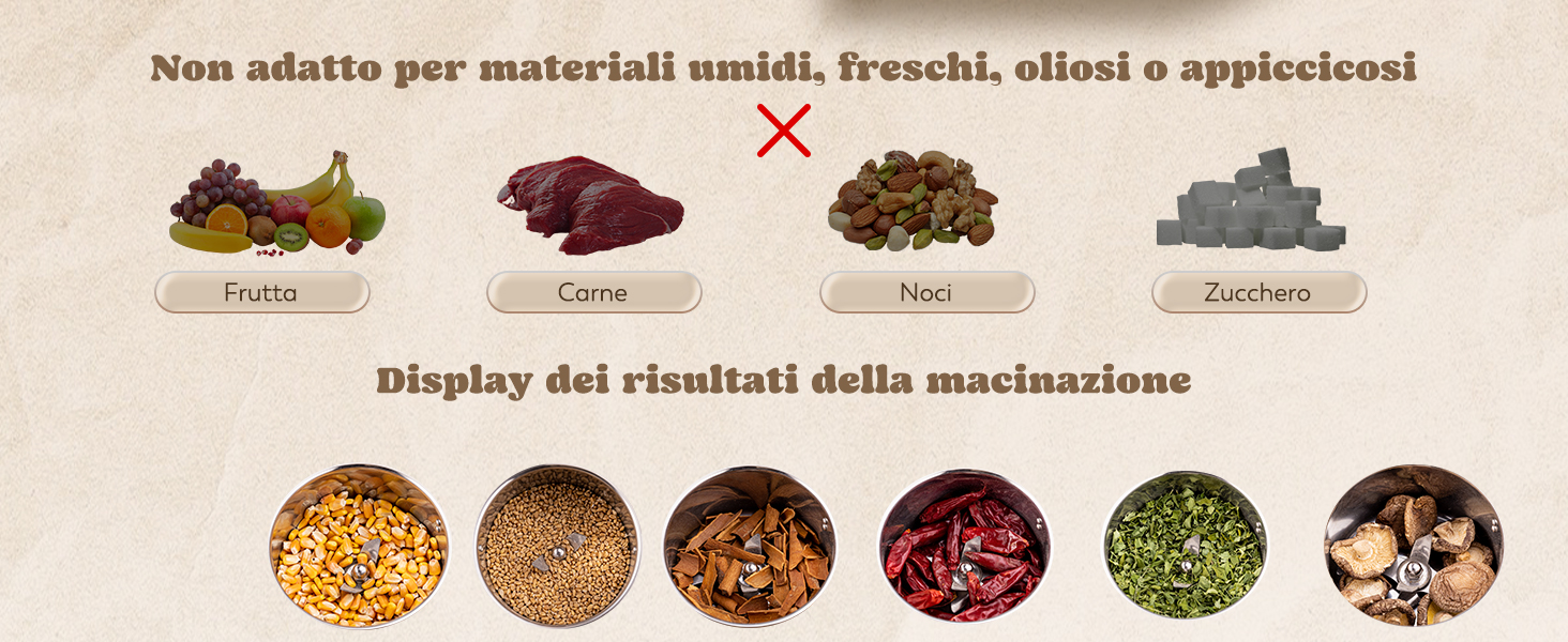 Informazioni su questo articolo 🌱 DESIGN OPEN-COVER-STOP E PROTEZIONE DA SOVRACCARICO - Il macina cereali è dotato di un dispositivo di sicurezza sul coperchio: se si apre il coperchio durante la macinazione, smetterà di funzionare immediatamente. *Se non può iniziare a funzionare dopo essere stato acceso, potrebbe essere perché gli interruttori a induzione all'interno del dispositivo di sicurezza non sono attivati. Regola per assicurarti che sia spinto fino in fondo alle due strutture della fibbia su entrambi i lati. 🌱 ACCIAIO INOSSIDABILE - L'intero corpo è realizzato in acciaio inossidabile di alta qualità e soddisfa i requisiti di sicurezza alimentare. Facile iniziare a lavorare semplicemente premendo l'interruttore di alimentazione. * Raccomandiamo che il tempo di utilizzo non superi i 3min. Non operare continuamente e prendere 5-10min per riposare ogni 3min di lavoro. Se non sei soddisfatto dell'effetto macinatura, puoi setacciare le particelle grossolane con uno schermo a maglie e macinarle di nuovo. 🌱 MULINO MULTIUSO - Applicabile per polverizzare tutti i tipi di materiali secchi, inclusi cereali, spezie ed erbe, come riso, semi di soia, chicchi di caffè, mais, grano, sale, pepe, cumino, peperoncino secco, ginseng, sesamo ... NOTA] Il materiale da macinare deve essere sufficientemente asciutto, privo di umidità e grasso. Assicurarsi che i materiali da macinare coprano la lama lunga e non più di 2/3 della vasca per lasciare spazio alla rotazione della lama durante la molatura. 🌱 COME PULIRE E SOSTITUIRE LE LAME - La caraffa non è rimovibile, quindi NON PU so essere pulita direttamente con acqua. Puoi pulire la polvere rimanente all'interno del barattolo con uno spazzolino e poi pulire l'interno del barattolo con un panno asciutto. * Per rimuovere le lame, utilizzare un cacciavite per tenere la vite centrale e ruotare la chiave o il manicotto in senso antiorario per allentare il controdado sulla lama. 🌱 SPECIFICHE - Capacità: 700g; Grado di macinazione: 50-300 mesh; Orario di lavoro: 5 minuti; Tempo di intervallo: 5 minuti; Velocità di rotazione: 36000R/Min; Potenza: 2500W. (* Ci dispiace molto che ci siano piccoli graffi e buchi che non possono essere evitati durante il processo di produzione e lavorazione. Spero che tu possa capire :) [Per qualsiasi domanda o esigenza, ti preghiamo di contattarci in qualsiasi momento e ti forniremo un rapido risposta e miglior aiuto.] › Visualizza altri dettagli prodotto Informazioni su questo articolo 🌱 DESIGN OPEN-COVER-STOP E PROTEZIONE DA SOVRACCARICO - Il macina cereali è dotato di un dispositivo di sicurezza sul coperchio: se si apre il coperchio durante la macinazione, smetterà di funzionare immediatamente. *Se non può iniziare a funzionare dopo essere stato acceso, potrebbe essere perché gli interruttori a induzione all'interno del dispositivo di sicurezza non sono attivati. Regola per assicurarti che sia spinto fino in fondo alle due strutture della fibbia su entrambi i lati. 🌱 ACCIAIO INOSSIDABILE - L'intero corpo è realizzato in acciaio inossidabile di alta qualità e soddisfa i requisiti di sicurezza alimentare. Facile iniziare a lavorare semplicemente premendo l'interruttore di alimentazione. * Raccomandiamo che il tempo di utilizzo non superi i 3min. Non operare continuamente e prendere 5-10min per riposare ogni 3min di lavoro. Se non sei soddisfatto dell'effetto macinatura, puoi setacciare le particelle grossolane con uno schermo a maglie e macinarle di nuovo. 🌱 MULINO MULTIUSO - Applicabile per polverizzare tutti i tipi di materiali secchi, inclusi cereali, spezie ed erbe, come riso, semi di soia, chicchi di caffè, mais, grano, sale, pepe, cumino, peperoncino secco, ginseng, sesamo ... NOTA] Il materiale da macinare deve essere sufficientemente asciutto, privo di umidità e grasso. Assicurarsi che i materiali da macinare coprano la lama lunga e non più di 2/3 della vasca per lasciare spazio alla rotazione della lama durante la molatura. 🌱 COME PULIRE E SOSTITUIRE LE LAME - La caraffa non è rimovibile, quindi NON PU so essere pulita direttamente con acqua. Puoi pulire la polvere rimanente all'interno del barattolo con uno spazzolino e poi pulire l'interno del barattolo con un panno asciutto. * Per rimuovere le lame, utilizzare un cacciavite per tenere la vite centrale e ruotare la chiave o il manicotto in senso antiorario per allentare il controdado sulla lama. 🌱 SPECIFICHE - Capacità: 700g; Grado di macinazione: 50-300 mesh; Orario di lavoro: 5 minuti; Tempo di intervallo: 5 minuti; Velocità di rotazione: 36000R/Min; Potenza: 2500W. (* Ci dispiace molto che ci siano piccoli graffi e buchi che non possono essere evitati durante il processo di produzione e lavorazione. Spero che tu possa capire :) [Per qualsiasi domanda o esigenza, ti preghiamo di contattarci in qualsiasi momento e ti forniremo un rapido risposta e miglior aiuto.] › Visualizza altri dettagli prodotto Product details