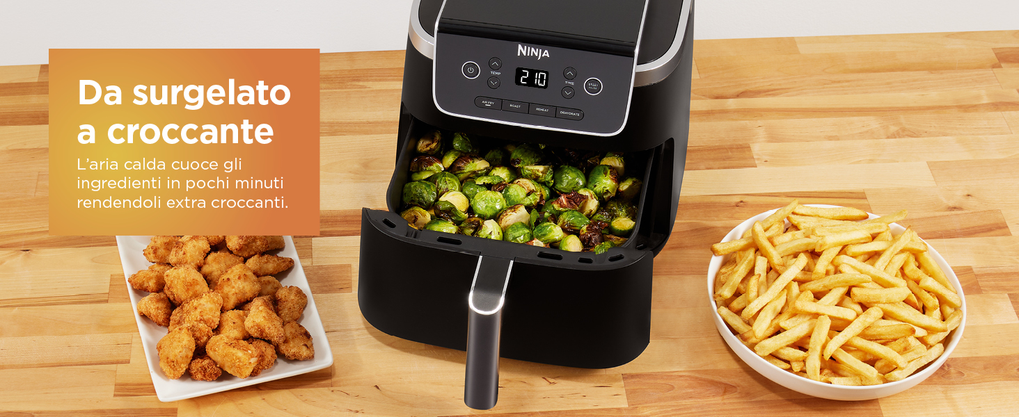Informazioni su questo articolo COTTURA CON POCO OLIO O SENZA: La tecnologia AirCrisp garantisce risultati croccanti. La funzione Air Fry permette di usare fino al 75% di grassi in meno* (*rispetto a patatine tagliate a mano e fritte in modo tradizionale) 4 FUNZIONI: Frittura ad aria, cottura arrosto, riscaldamento ed essicazione. Ottieni una croccantezza perfetta con un'ampia gamma di temperature fino a 210°C RISPARMIO ENERGETICO: Cuoci utilizzando meno energia di un forno* (test e calcoli basati sul tempo di cottura consigliato per le salsicce, utilizzando la funzione di frittura ad aria rispetto a un forno da 68l classe A e 71l classe A+) FORMATO FAMIGLIA: perfetta per 2 persone, il cestello da 4,7 L può contenere un pollo intero da 1 kg o fino a 500 g di patatine fritte INCLUDE: Friggitrice ad aria Ninja PRO (spina UE), cassetto da 4,7L e piastra antiaderente. Guida alle ricette creata dagli chef. 2000W. Peso: 4,8 kg. Colore: nero DIMENSIONI: A: 26,5 cm x L: 28,5 cm x P: 36 cm. › Visualizza altri dettagli prodotto Informazioni su questo articolo COTTURA CON POCO OLIO O SENZA: La tecnologia AirCrisp garantisce risultati croccanti. La funzione Air Fry permette di usare fino al 75% di grassi in meno* (*rispetto a patatine tagliate a mano e fritte in modo tradizionale) 4 FUNZIONI: Frittura ad aria, cottura arrosto, riscaldamento ed essicazione. Ottieni una croccantezza perfetta con un'ampia gamma di temperature fino a 210°C RISPARMIO ENERGETICO: Cuoci utilizzando meno energia di un forno* (test e calcoli basati sul tempo di cottura consigliato per le salsicce, utilizzando la funzione di frittura ad aria rispetto a un forno da 68l classe A e 71l classe A+) FORMATO FAMIGLIA: perfetta per 2 persone, il cestello da 4,7 L può contenere un pollo intero da 1 kg o fino a 500 g di patatine fritte INCLUDE: Friggitrice ad aria Ninja PRO (spina UE), cassetto da 4,7L e piastra antiaderente. Guida alle ricette creata dagli chef. 2000W. Peso: 4,8 kg. Colore: nero DIMENSIONI: A: 26,5 cm x L: 28,5 cm x P: 36 cm. › Visualizza altri dettagli prodotto Product details
