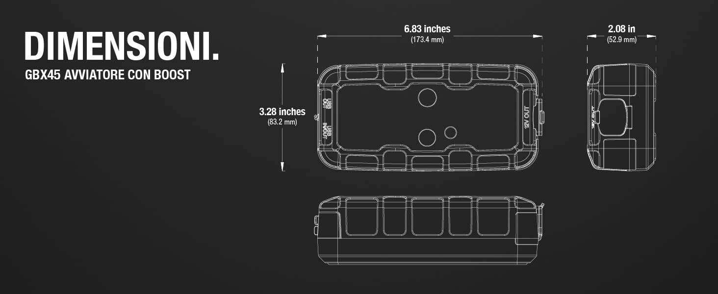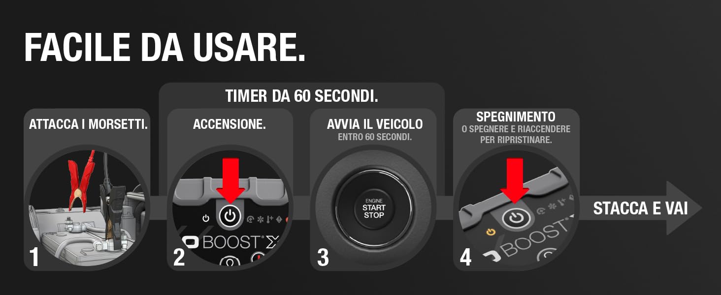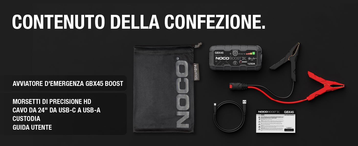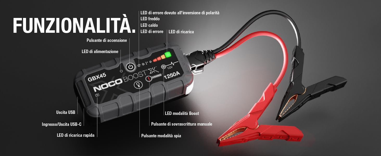 Informazioni su questo articolo X PER EXTREME — Un design completamente nuovo con una potenza di avviamento estrema per motori potenti. Con una potenza nominale di 1250 ampere, questo avviatore di emergenza al litio portatile rilascia la massima energia a ogni avviamento. Non è un semplice aggiornamento, è una serie completamente nuova: la Serie Extreme. RICARICA TURBO — Dotato di tecnologia USB-C che, combinata con il power delivery, offre ricariche fulminee. Si ricarica completamente in soli 48 minuti, o passa dallo 0% all'avviamento in soli 5 minuti di carica. CARICA TUTTO — Con la tecnologia USB-C Power Delivery, hai il potere di caricare quasi tutto. Il power bank interno fornisce 60 watt di potenza - sia in entrata che in uscita - per alimentare senza sforzo i tuoi dispositivi USB-C preferiti, come telefoni, tablet, laptop, indossabili e altro ancora. ULTRASAFE 2.0 — Abbiamo migliorato la nostra tecnologia UltraSafe. Rimane il nostro design semplice e a prova di errore con tecnologia anti-scintilla e protezione contro l'inversione di polarità, ma con una maggiore efficienza termica e gestione dell'energia per offrire migliori prestazioni e una durata della batteria più lunga. MASSIMA VERSATILITÀ — Boost X è uno degli avviatori al litio più versatili di sempre. Avvia tutti i tipi di veicoli, inclusi auto, moto, camion, camper, trattori e altro ancora, con motori a benzina fino a 6,5 litri e diesel fino a 4,0 litri. COSA C'È NELLA CONFEZIONE — All'interno troverai l'avviatore di emergenza GBX45, morsetti booster resistenti, cavo di ricarica USB-C e una borsa in microfibra per il trasporto. Include inoltre una garanzia di un anno ed è orgogliosamente progettato negli Stati Uniti. › Visualizza altri dettagli prodotto Informazioni su questo articolo X PER EXTREME — Un design completamente nuovo con una potenza di avviamento estrema per motori potenti. Con una potenza nominale di 1250 ampere, questo avviatore di emergenza al litio portatile rilascia la massima energia a ogni avviamento. Non è un semplice aggiornamento, è una serie completamente nuova: la Serie Extreme. RICARICA TURBO — Dotato di tecnologia USB-C che, combinata con il power delivery, offre ricariche fulminee. Si ricarica completamente in soli 48 minuti, o passa dallo 0% all'avviamento in soli 5 minuti di carica. CARICA TUTTO — Con la tecnologia USB-C Power Delivery, hai il potere di caricare quasi tutto. Il power bank interno fornisce 60 watt di potenza - sia in entrata che in uscita - per alimentare senza sforzo i tuoi dispositivi USB-C preferiti, come telefoni, tablet, laptop, indossabili e altro ancora. ULTRASAFE 2.0 — Abbiamo migliorato la nostra tecnologia UltraSafe. Rimane il nostro design semplice e a prova di errore con tecnologia anti-scintilla e protezione contro l'inversione di polarità, ma con una maggiore efficienza termica e gestione dell'energia per offrire migliori prestazioni e una durata della batteria più lunga. MASSIMA VERSATILITÀ — Boost X è uno degli avviatori al litio più versatili di sempre. Avvia tutti i tipi di veicoli, inclusi auto, moto, camion, camper, trattori e altro ancora, con motori a benzina fino a 6,5 litri e diesel fino a 4,0 litri. COSA C'È NELLA CONFEZIONE — All'interno troverai l'avviatore di emergenza GBX45, morsetti booster resistenti, cavo di ricarica USB-C e una borsa in microfibra per il trasporto. Include inoltre una garanzia di un anno ed è orgogliosamente progettato negli Stati Uniti. › Visualizza altri dettagli prodotto Product details
