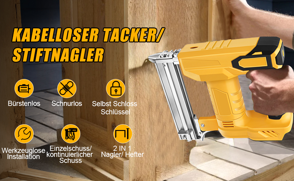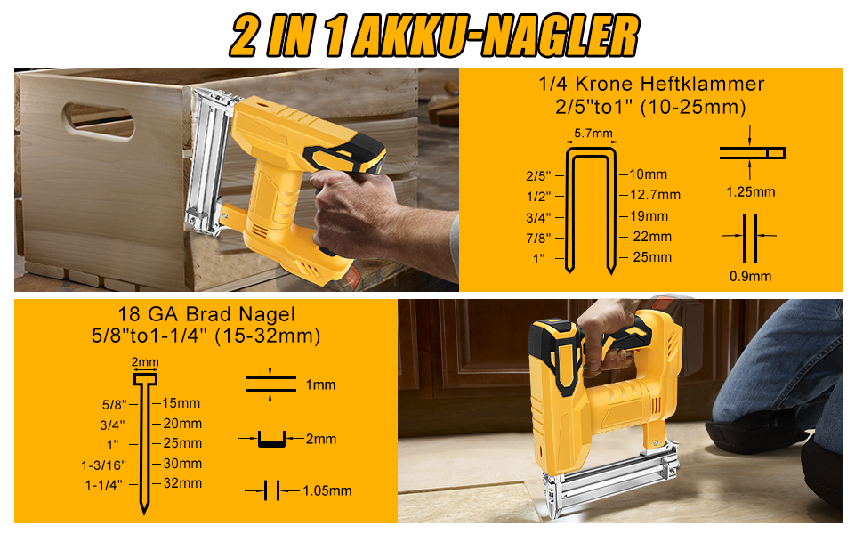 Informazioni su questo articolo Compatibilità: pistola da 18 V compatibile con batteria Dewalt da 20 V. (La confezione non include batteria e caricatore) Potente batteria da 100 W: il numero di chiodi è di circa 2400 (batteria da 1,5 Ah), 3200 (batteria da 2 Ah), 4800 (batteria da 3 Ah), 6400 (batteria da 4 Ah), 8000 (batteria da 5 Ah), 9600 (batteria da 6 Ah) Nessun danno alla superficie di lavoro: la chiodatrice a batteria leggera facilita il lavoro in interni ed esterni. Pistola per spillatrice: il naso di sicurezza protegge dagli incidenti, per una doppia protezione è inoltre dotato di un interruttore di sicurezza. Chiodatrice/pinzatrice 2 in 1: il cambio senza problemi tra graffette e chiodi è possibile senza cambiare dispositivo. Potente pinzatrice per una facile e veloce applicazione delle graffette. La cucitrice elettrica è un tuttofare funzionale in casa, in officina o nella stanza di bricolage. Chiodi/graffette incluse: la chiodatrice a batteria con 500 chiodi e 500 graffette è ideale per applicazioni fai da te che richiedono una maggiore libertà di movimento. › Visualizza altri dettagli prodotto Informazioni su questo articolo Compatibilità: pistola da 18 V compatibile con batteria Dewalt da 20 V. (La confezione non include batteria e caricatore) Potente batteria da 100 W: il numero di chiodi è di circa 2400 (batteria da 1,5 Ah), 3200 (batteria da 2 Ah), 4800 (batteria da 3 Ah), 6400 (batteria da 4 Ah), 8000 (batteria da 5 Ah), 9600 (batteria da 6 Ah) Nessun danno alla superficie di lavoro: la chiodatrice a batteria leggera facilita il lavoro in interni ed esterni. Pistola per spillatrice: il naso di sicurezza protegge dagli incidenti, per una doppia protezione è inoltre dotato di un interruttore di sicurezza. Chiodatrice/pinzatrice 2 in 1: il cambio senza problemi tra graffette e chiodi è possibile senza cambiare dispositivo. Potente pinzatrice per una facile e veloce applicazione delle graffette. La cucitrice elettrica è un tuttofare funzionale in casa, in officina o nella stanza di bricolage. Chiodi/graffette incluse: la chiodatrice a batteria con 500 chiodi e 500 graffette è ideale per applicazioni fai da te che richiedono una maggiore libertà di movimento. › Visualizza altri dettagli prodotto Product details