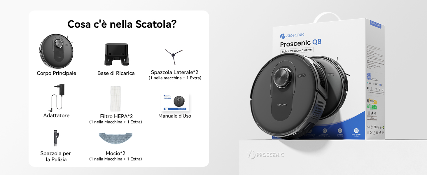 Marchio Proscenic Nome modello Proscenic Q8 Caratteristica speciale (function(f) {var _np=(window.P._namespace("DetailPageProductOverviewTemplatesJava"));if(_np.guardFatal){_np.guardFatal(f)(_np);}else{f(_np);}}(function(P) { P.when('A').execute(function(A){ A.on('a:truncate:po-attribute-truncate-2:updated', function(data) { var isTruncated = !data.truncateInstance.getIfTextFits(); var seeMoreElement = document.getElementById('po-attribute-see-more-id-2'); if(seeMoreElement) { seeMoreElement.style.display = isTruncated ? '' : 'none'; } }) });})); ✰4.200Pa Potente Aspirazione ✰Durata a 200min ✰Batteria ad Alta Capacità da 3.200 mAh ✰Aspirapolvere e Lavapavimenti 2-in-1 ✰Intelligente 360°Laser Navigazione ✰Evitamento degli Ostacoli ✰Zone Vietate & Muri Invisibili ✰Pulizia a Zigzag & a Matrice ✰Mappe Multi-Livello Mostra altro Colore Nero Dimensioni del prodotto 32L x 32l x 9,7H cm Product details