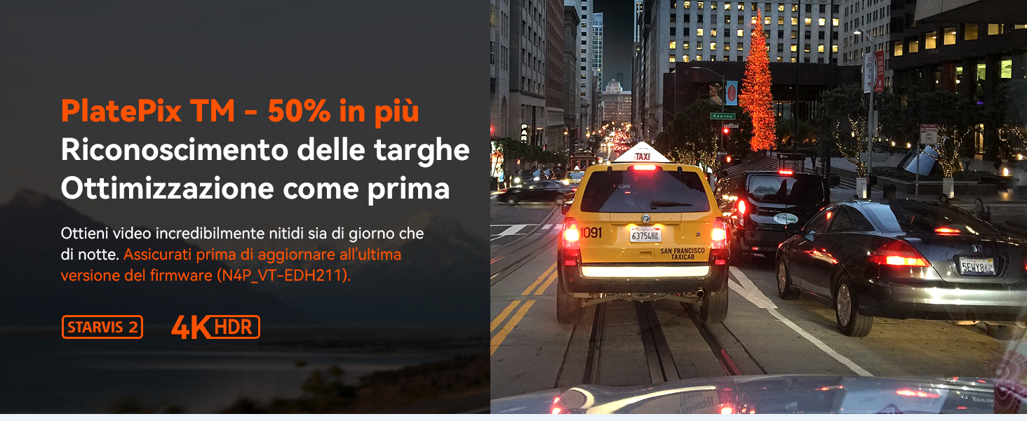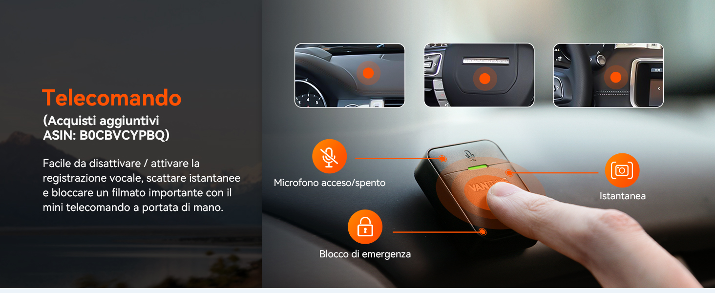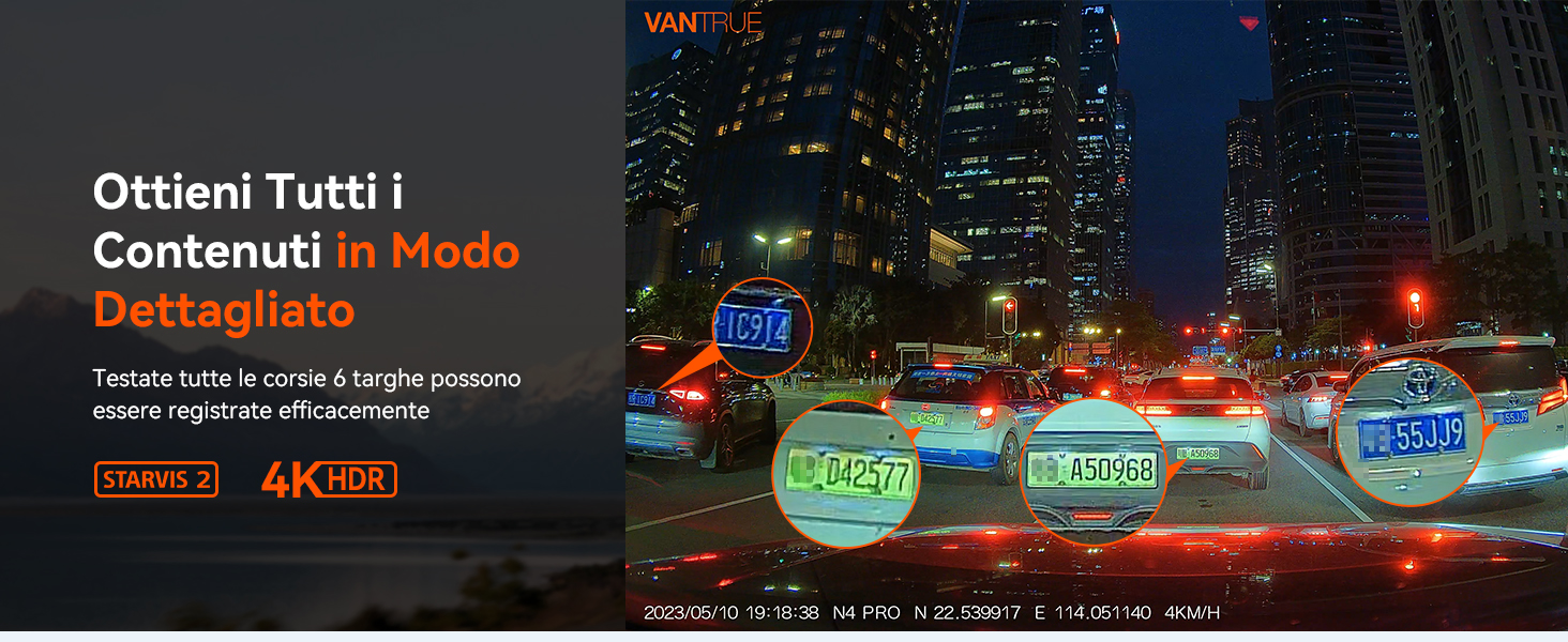 Informazioni su questo articolo 【STARVIS 2/ 4K HDR + 1080P HDR + 1080P HDR】: La dashcam VANTRUE N4 Pro è in cima alla classifica delle dashcam di fascia alta per una buona ragione. Grazie al sensore avanzato Sony IMX678 e alla tripla sorveglianza HDR - frontale (158°), interna (160°) e posteriore (165°) con apertura F1.8 - cattura ogni dettaglio, dalle targhe ai video di emergenza. La N4 PRO ricostruisce perfettamente qualsiasi scena di incidente, aiutando i proprietari di auto a risolvere facilmente dispute stradali, sia di giorno che di notte. 【IMX678 + 3 HDR + MIGLIORE VISIONE NOTTURNA A INFRAROSSI】: È la prima dashcam per auto a 3 lenti con HDR che, grazie al sensore STARVIS 2 IMX678 e alla risoluzione 4K, aumenta la sensibilità alla luce del 90%. Ciò significa che anche in condizioni di scarsa illuminazione i video risultano il doppio più nitidi. La qualità dell'immagine si adatta automaticamente in tempo reale, migliorando la visione notturna e rendendo ogni scena più chiara e realistica. La visione notturna a infrarossi è perfetta per chi lavora con taxi, Uber IT Taxi o Lyft. 【50% DI MIGLIORAMENTO NEL RICONOSCIMENTO TARGHE DOPO L'AGGIORNAMENTO】: La modalità PlatePix migliora il riconoscimento delle targhe del 50%, garantendo video più nitidi sia di giorno che di notte. È importante aggiornare all'ultima versione della firmware (N4P_VT-EDH211) tramite l'app VANTRUE con pochi semplici passaggi. Grazie alla tecnologia WiFi, puoi aggiornare la tua dashcam gratuitamente e accedere a tutte le nuove funzionalità senza costi aggiuntivi. 【5 GHz WiFi , GPS E COMANDA VOCALI】: La N4 PRO ti permette di visualizzare in tempo reale, scaricare video (fino a 9 MB/s) e condividere i tuoi viaggi con amici e parenti direttamente sul tuo telefono. Il GPS integrato registra la posizione e la velocità, fornendo prove decisive in caso di incidenti. Inoltre, con i comandi vocali in inglese, puoi gestire la dashcam senza distrarti dalla guida, rendendo l’uso ancora più semplice e pratico. 【REGISTRAZIONE CONTINUA + G-SENSOR + AUDIO】: La dashcam registra continuamente, sovrascrivendo automaticamente i vecchi file con clip di 1/3/5 minuti quando la scheda SD è piena. Supporta schede di memoria fino a 512GB; si consiglia l'uso delle schede VANTRUE. Il G-sensor blocca automaticamente i video in caso di urti improvvisi, garantendo che le prove non vengano sovrascritte. Il microfono e l'altoparlante integrati assicurano una qualità audio eccellente. 【SODDISFAZIONE GARANTITA】: Siamo certi che la dashcam VANTRUE N4 Pro ti conquisterà. Puoi migliorare la tua esperienza con accessori come il filtro CPL (B0B2WCN1FD), che bilancia l'esposizione e rende i colori più vivaci, o il telecomando wireless (B0CBVCYPBQ) per un accesso rapido a registrazioni e audio. Il nostro servizio clienti è a disposizione per qualsiasi problema, e registrandoti sul sito VANTRUE otterrai una garanzia estesa fino a 18 mesi. › Visualizza altri dettagli prodotto Informazioni su questo articolo 【STARVIS 2/ 4K HDR + 1080P HDR + 1080P HDR】: La dashcam VANTRUE N4 Pro è in cima alla classifica delle dashcam di fascia alta per una buona ragione. Grazie al sensore avanzato Sony IMX678 e alla tripla sorveglianza HDR - frontale (158°), interna (160°) e posteriore (165°) con apertura F1.8 - cattura ogni dettaglio, dalle targhe ai video di emergenza. La N4 PRO ricostruisce perfettamente qualsiasi scena di incidente, aiutando i proprietari di auto a risolvere facilmente dispute stradali, sia di giorno che di notte. 【IMX678 + 3 HDR + MIGLIORE VISIONE NOTTURNA A INFRAROSSI】: È la prima dashcam per auto a 3 lenti con HDR che, grazie al sensore STARVIS 2 IMX678 e alla risoluzione 4K, aumenta la sensibilità alla luce del 90%. Ciò significa che anche in condizioni di scarsa illuminazione i video risultano il doppio più nitidi. La qualità dell'immagine si adatta automaticamente in tempo reale, migliorando la visione notturna e rendendo ogni scena più chiara e realistica. La visione notturna a infrarossi è perfetta per chi lavora con taxi, Uber IT Taxi o Lyft. 【50% DI MIGLIORAMENTO NEL RICONOSCIMENTO TARGHE DOPO L'AGGIORNAMENTO】: La modalità PlatePix migliora il riconoscimento delle targhe del 50%, garantendo video più nitidi sia di giorno che di notte. È importante aggiornare all'ultima versione della firmware (N4P_VT-EDH211) tramite l'app VANTRUE con pochi semplici passaggi. Grazie alla tecnologia WiFi, puoi aggiornare la tua dashcam gratuitamente e accedere a tutte le nuove funzionalità senza costi aggiuntivi. 【5 GHz WiFi , GPS E COMANDA VOCALI】: La N4 PRO ti permette di visualizzare in tempo reale, scaricare video (fino a 9 MB/s) e condividere i tuoi viaggi con amici e parenti direttamente sul tuo telefono. Il GPS integrato registra la posizione e la velocità, fornendo prove decisive in caso di incidenti. Inoltre, con i comandi vocali in inglese, puoi gestire la dashcam senza distrarti dalla guida, rendendo l’uso ancora più semplice e pratico. 【REGISTRAZIONE CONTINUA + G-SENSOR + AUDIO】: La dashcam registra continuamente, sovrascrivendo automaticamente i vecchi file con clip di 1/3/5 minuti quando la scheda SD è piena. Supporta schede di memoria fino a 512GB; si consiglia l'uso delle schede VANTRUE. Il G-sensor blocca automaticamente i video in caso di urti improvvisi, garantendo che le prove non vengano sovrascritte. Il microfono e l'altoparlante integrati assicurano una qualità audio eccellente. 【SODDISFAZIONE GARANTITA】: Siamo certi che la dashcam VANTRUE N4 Pro ti conquisterà. Puoi migliorare la tua esperienza con accessori come il filtro CPL (B0B2WCN1FD), che bilancia l'esposizione e rende i colori più vivaci, o il telecomando wireless (B0CBVCYPBQ) per un accesso rapido a registrazioni e audio. Il nostro servizio clienti è a disposizione per qualsiasi problema, e registrandoti sul sito VANTRUE otterrai una garanzia estesa fino a 18 mesi. › Visualizza altri 