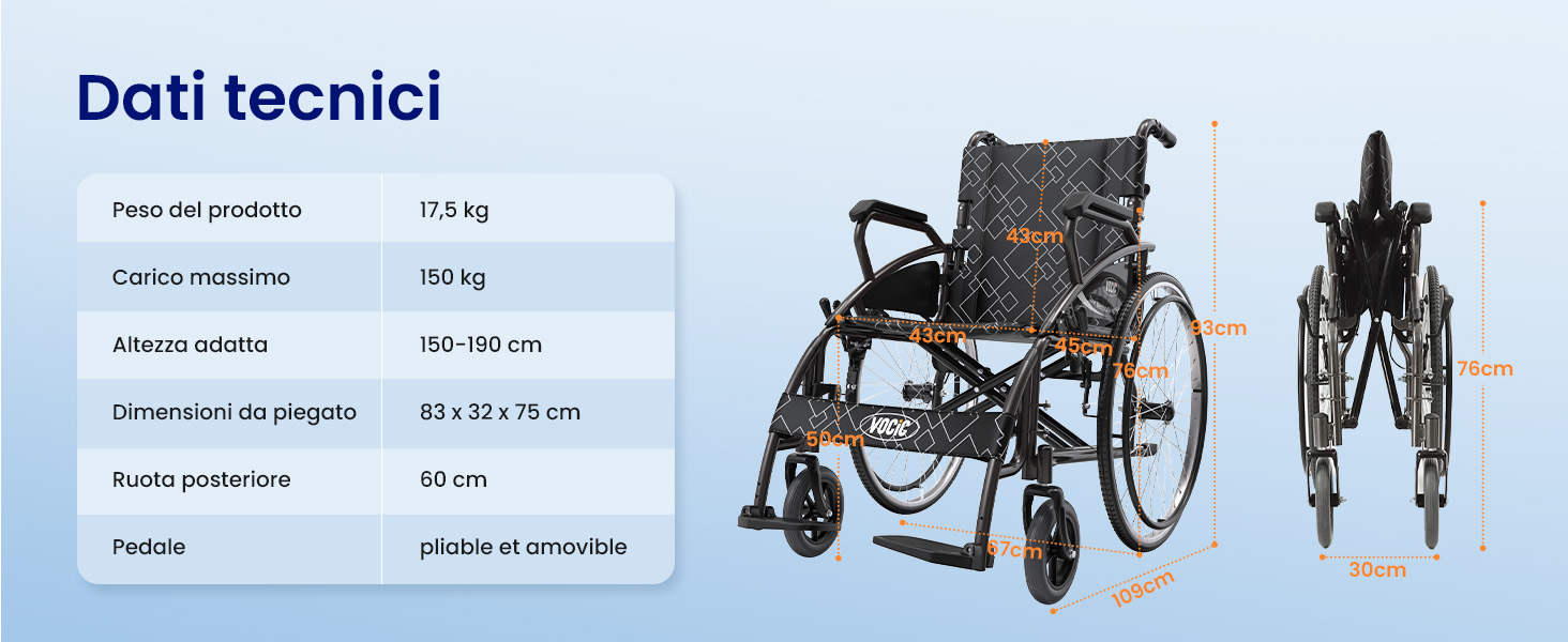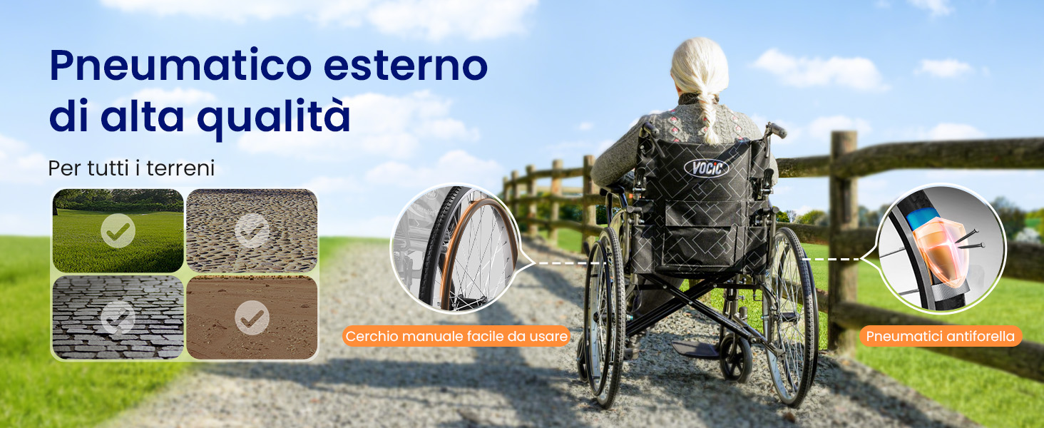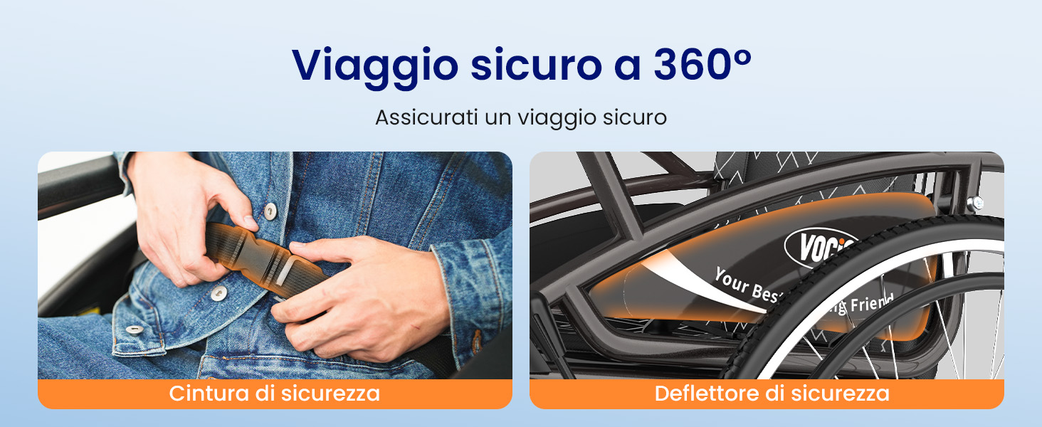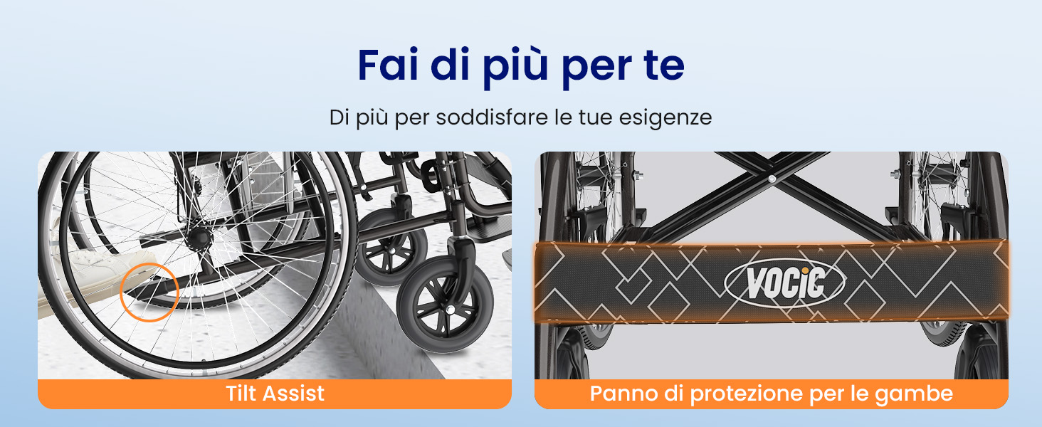 Informazioni su questo articolo 【Molto leggera e portatile】 La sedia a rotelle VOCIC U31 è realizzata in acciaio al carbonio leggero di alta qualità e pesa solo 17,5 kg. Anche le persone anziane possono indossarlo senza problemi! L'innovativo design di piegatura rapida in 3 secondi ti consente di riporlo facilmente. Capacità di carico massima: 150 kg 【Modalità Autonoma e Passiva】Il design a doppia modalità offre maggiore flessibilità. La modalità di guida autonoma consente di spostarsi autonomamente su brevi distanze regolando la direzione e la velocità della sedia a rotelle. La modalità di spinta manuale può garantire la stabilità e la sicurezza della sedia a rotelle e aiutarti a guidare meglio in salita e superare gli ostacoli. 【Pneumatici con Protezione Antiforatura Top】Le ruote posteriori resistenti all'usura da 60 cm hanno eccellenti proprietà di assorbimento degli urti e antiscivolo. Possono attraversare facilmente terreni irregolari e rimanere stabili su superfici lisce. Il grande anello a forma di onda è liscio e non graffierà le mani, facilitandone l'utilizzo. Gli pneumatici hanno superato decine di migliaia di test di usura. La ruota anteriore in PU girevole a 360° facilita la svolta. 【Telaio a Doppia X Stabile】 La sedia a rotelle utilizza acciaio al carbonio di alta qualità, che è più resistente all'usura. Il telaio complessivo del corpo adotta una struttura a doppia X, stabile e resistente. Rispetto al tradizionale design a X singola, può rimanere stabile anche su terreni estremamente irregolari e non è facile da scuotere. 【Sicurezza a 360°】Il design a doppio freno con freno a maniglia sensibile e freno a mano offre maggiore flessibilità e offre doppia sicurezza rispetto ai modelli di sistemi a freno singolo disponibili sul mercato. È inoltre dotato di cinture di sicurezza e gambali aggiuntivi per aumentare la sicurezza durante il trasporto. Il design della piastra protettiva sul lato del bracciolo protegge le braccia da attriti o collisioni. 【Standard di Qualità EU】Il sedile e lo schienale realizzati in tessuto Oxford spesso 4 cm sono più traspiranti e offrono un supporto confortevole. Il poggiapiedi reversibile facilita la seduta sulla sedia a rotelle e il design rimovibile consente un facile stoccaggio. Dotato di ausilio basculante sotto la sedia a rotelle per poter superare facilmente gli ostacoli. Puoi riporlo facilmente nella tasca dello schienale. 【Installazione Semplice & 5 Anni di Garanzia】Questo prodotto è stato preinstallato, sono necessari solo alcuni semplici passaggi di installazione per utilizzarlo. VOCIC offre una garanzia extra lunga di 5 anni, così puoi stare tranquillo dopo l'acquisto e il team post-vendita professionale è qui per te. Tutti i problemi saranno risolti entro 24 ore. › Visualizza altri dettagli prodotto Informazioni su questo articolo 【Molto leggera e portatile】 La sedia a rotelle VOCIC U31 è realizzata in acciaio al carbonio leggero di alta qualità e pesa solo 17,5 kg. Anche le persone anziane possono indossarlo senza problemi! L'innovativo design di piegatura rapida in 3 secondi ti consente di riporlo facilmente. Capacità di carico massima: 150 kg 【Modalità Autonoma e Passiva】Il design a doppia modalità offre maggiore flessibilità. La modalità di guida autonoma consente di spostarsi autonomamente su brevi distanze regolando la direzione e la velocità della sedia a rotelle. La modalità di spinta manuale può garantire la stabilità e la sicurezza della sedia a rotelle e aiutarti a guidare meglio in salita e superare gli ostacoli. 【Pneumatici con Protezione Antiforatura Top】Le ruote posteriori resistenti all'usura da 60 cm hanno eccellenti proprietà di assorbimento degli urti e antiscivolo. Possono attraversare facilmente terreni irregolari e rimanere stabili su superfici lisce. Il grande anello a forma di onda è liscio e non graffierà le mani, facilitandone l'utilizzo. Gli pneumatici hanno superato decine di migliaia di test di usura. La ruota anteriore in PU girevole a 360° facilita la svolta. 【Telaio a Doppia X Stabile】 La sedia a rotelle utilizza acciaio al carbonio di alta qualità, che è più resistente all'usura. Il telaio complessivo del corpo adotta una struttura a doppia X, stabile e resistente. Rispetto al tradizionale design a X singola, può rimanere stabile anche su terreni estremamente irregolari e non è facile da scuotere. 【Sicurezza a 360°】Il design a doppio freno con freno a maniglia sensibile e freno a mano offre maggiore flessibilità e offre doppia sicurezza rispetto ai modelli di sistemi a freno singolo disponibili sul mercato. È inoltre dotato di cinture di sicurezza e gambali aggiuntivi per aumentare la sicurezza durante il trasporto. Il design della piastra protettiva sul lato del bracciolo protegge le braccia da attriti o collisioni. 【Standard di Qualità EU】Il sedile e lo schienale realizzati in tessuto Oxford spesso 4 cm sono più traspiranti e offrono un supporto confortevole. Il poggiapiedi reversibile facilita la seduta sulla sedia a rotelle e il design rimovibile consente un facile stoccaggio. Dotato di ausilio basculante sotto la sedia a rotelle per poter superare facilmente gli ostacoli. Puoi riporlo facilmente nella tasca dello schienale. 【Installazione Semplice & 5 Anni di Garanzia】Questo prodotto è stato preinstallato, sono necessari solo alcuni semplici passaggi di installazione per utilizzarlo. VOCIC offre una garanzia extra lunga di 5 anni, così puoi stare tranquillo dopo l'acquisto e il team post-vendita professionale è qui per te. Tutti i problemi saranno risolti entro 24 ore. › Visualizza altri dettagli prodotto Product details